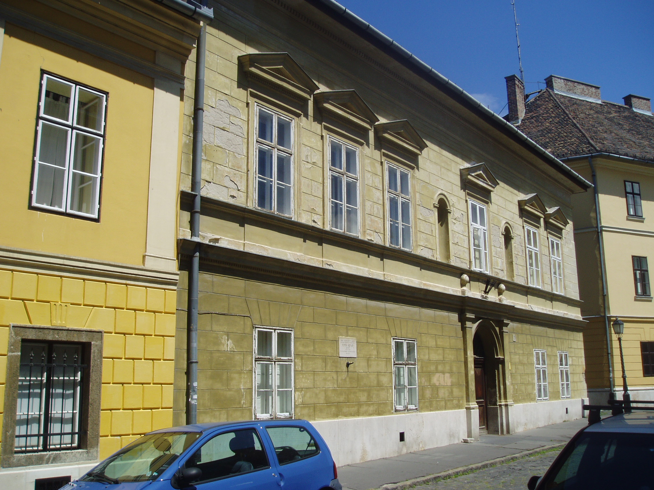 Nyilvános 1260 | 1986 | Budapest I. Táncsics Mihály utca 13. | Az egyemeletes ház középkori alapokra épült. 1823-ban, majd mai formájára 1880-ban alakították át. Mint a homlokzatán elhelyezett emléktáblán is olvasható, itt élt - egy első emeleti kis, bérelt lakásban - élete utolsó tíz évében Tóth Árpád (1886-1928) költő feleségével, Annuskával és 1920-ban született kislányával, Eszterrel. Itt írta Az öröm illan és a Lélektől lélekig c. köteteinek legtöbb versét. Lakásán hunyt el 1928. november 7-én tüdőbajban. Lánya, Tóth Eszter, aki édesapja halálakor mindössze nyolc éves volt, szintén irodalmár - költő, író, műfordító -lett. Édesapjáról, családjáról - köztük apai nagyapjáról, Tóth András szobrászról - emlékezéseket, tanulmányokat írt, bennük sok eredeti forrást, levelet is közzétett. A fénykép 2007 májusában készült. Felh. irod.: Zakariás G. Sándor: Budapest. Bp., Képzőműv. Alap, 1961 /Magyarország művészeti emlékei 3./ Erős Zoltán: Magyar irodalmi helynevek A-tól Z-ig. 2. bőv. átd. kiad. Bp. Kis-Lant Kiadó, 1995 Tóth Eszter: Családi emlékek Tóth Árpádról. Bp. Magvető, 1985 |