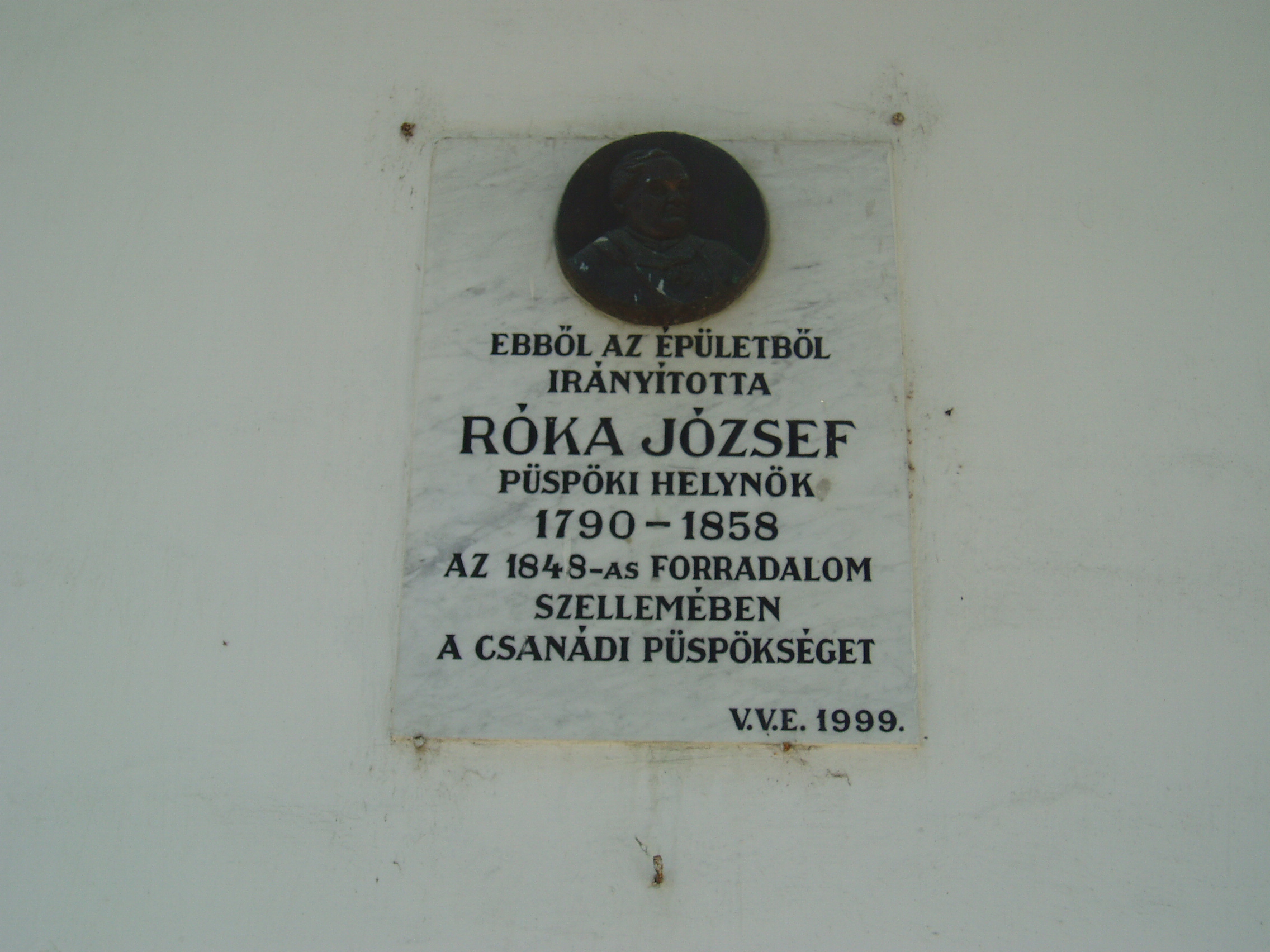 Nyilvános 1199 | 1608 | Makó, Csanád vezér tér 12. | A volt püspöki nyaralókastélyt a Temesvárott lakó Kőszeghy László csanádi püspök emeltette 1826-ban a hozzá csatlakozó dór oszlopos kápolnával együtt. A külső homlokzaton jeles, az épülethez kötődő csanádi püspökök, illetve püspöki helynök emléktábláit helyezték el. A képen Róka József (1790-1858) püspöki helynök emléktáblája látható. Az ő elnökletével nyilvánította ki a püspöki szentszék, hogy ők minden világi hatalomtól függetlenek, így a temesvári osztrák városparancsnok utasítását, miszerint tagadják meg a forradalmi kormányt, el nem fogadhatják. A címzetes püspök a püspökség székvárosában, Temesvárott maradt, Róka József pedig a szentszék jegyzőkönyveivel átköltözött Makóra, ahol a környék plébánosaiból létrehozta a szentszéket s innét irányította püspökségét. A szabadságharc bukása után Róka Józsefet kötél általi halálra ítélték, ezt 20 évi várbörtönre változtatták, majd a máriaradnai kolostorba internálták. Ott hunyt el 1858-ban. A fénykép 2007 júliusában készült. Felh. irod.: Barangolások Csongrád megyében. Miskolc, Well-PRess, 1997 Sarnyai Csaba Máté: Határozott kiállás egy történelmi pillanatban. A Csanádi Püspöki Szentszék fellépése az uralkodói manifesztummal és a császárhű temesvári katonai parancsnoksággal szemben 1848 októberében. = Korunk 2002. 7. |