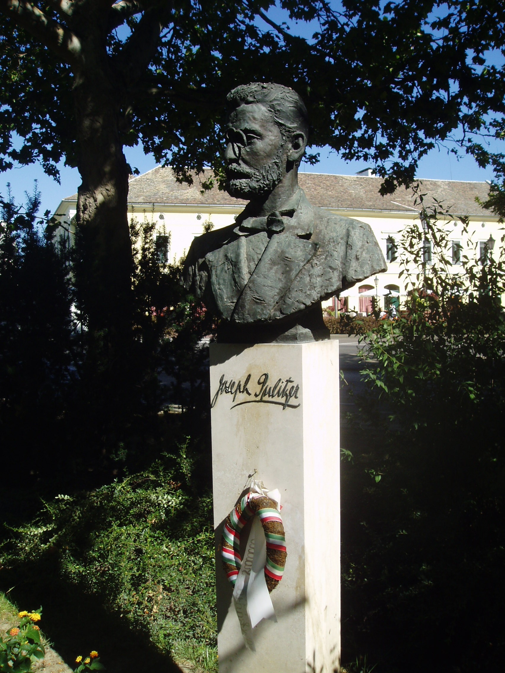 Nyilvános 1115 | 1561 | Makó, Széchenyi tér 13-15. | A Széchenyi teret déli oldalról az 1970-ben épült ún. csipkeházsor határolja, földszintjén üzletekkel. A házsor előtti kis parksávban a makói születésű Pulitzer József (1847-1911) mellszobra áll (Kiss Jenő alkotása). Az egyetemes sajtótörténet kiemelkedő alakja a makói városháza közelében, az Úri utca 4. számú, azóta emléktáblával megjelölt házban született (sajnos, amikor Makón jártam, ezt az információt még nem tudtam, ezért nincs róla kép - K.K.). Elszegényedett kereskedőcsaládból származott, iskoláit Budapesten végezte. A katonai pálya iránt vonzódott, de gyenge egészsége, rossz szeme miatt sorra elutasította az osztrák hadsereg, a francia idegenlégió és az angol gyarmati hadsereg. Tizenhat évesen hajófűtőként vándorolt ki Amerikába, ahol még éppen részt vehetett a polgárháború utolsó szakaszában. A Vadnyugaton számos mesterséget megpróbált, volt sikertelen öszvérápoló, bálnavadász és temetőgondnok, végül bánatában újságírónak állt. Egy St. Louis-i német laphoz szegődött el, ahol hamar kedveltté váltak színes, érdekes írásai. Fokozatosan egyre nagyobb részesedést vásárolt az újságban, végül tulajdonos lett, majd felvásárolta és egyesítette a város lapjait. Miután 1869-ben megkapta az amerikai állampolgárságot, New Yorkba költözött, ahol - a Hearst-lapokkal rivalizálva - megalapította saját média-birodalmát. Romló látása és gyengülő egészsége miatt 1887-től fokozatosan visszavonult a napi munkától, de az irányítást megtartotta. Jachtján hunyt el 1911-ben. Benne tisztelik a modern hírlapírás atyját, aki azt vallotta: "a sajtó legfőbb küldetése nem csupán a hírközlés, hanem a közszolgálatiság". Magyarságát soha nem tagadta meg, egyszer haza is látogatott. Ő volt az amerikai Kongresszus első magyar származású tagja. Nevét emléktábla őrzi a New York jelképének számító Szabadság-szobor alján: ő szervezte meg a szobor felállítását segítő sajtókampányt. Hatalmas vagyonának nagy részét is jótékonysági célokra adományozta. Az általa létrehozott alapítvány kamataiból osztják 1917 óta minden évben a mára legendává vált Pulitzer-díjakat, az újságírók legnagyobb és legirigyeltebb kitüntetéseit. A díjazottak között olyan nagyságok szerepelnek, mint John Steinbeck, Ernest Hemingway vagy John F. Kennedy. Hazánkban 1991 óta ítélik oda a Joseph Pulitzer-emlékdíjakat. A fénykép 2007 júliusában készült. Felh. irod.: Barangolások Csongrád megyében. Miskolc, Well-PRess, 1997 www.mzsh.hu/pulitzer.html |