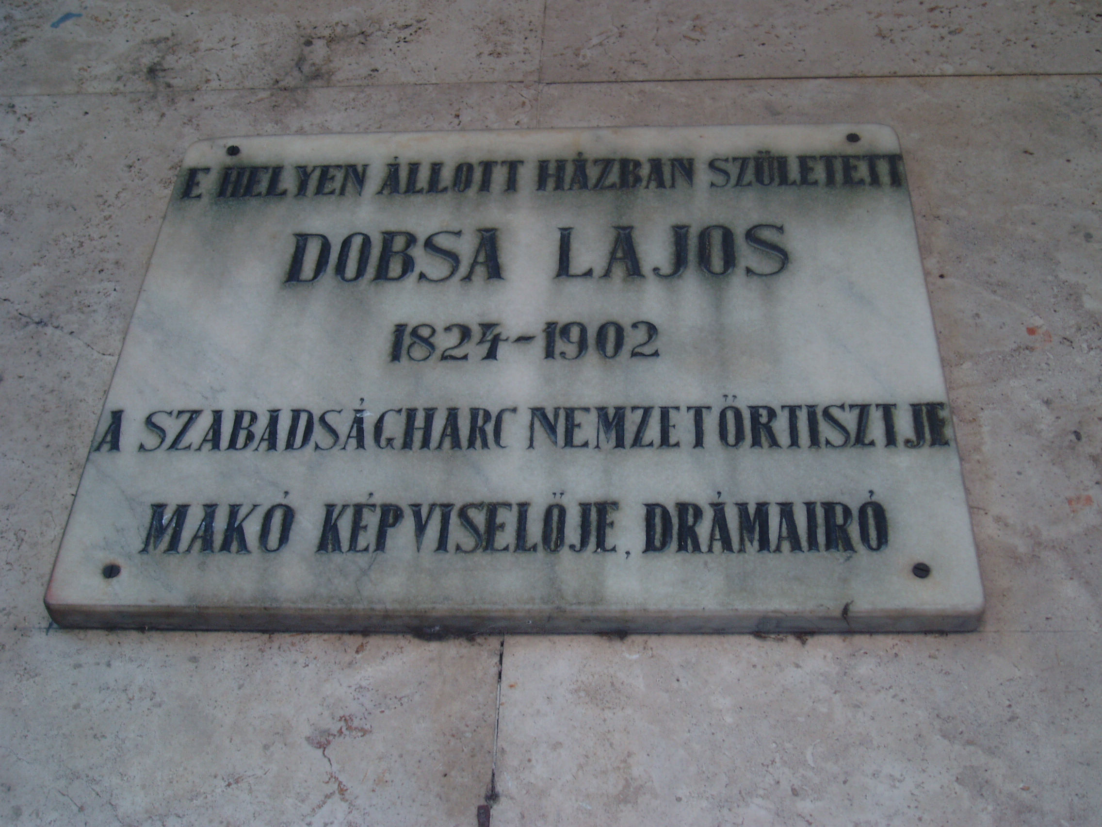 Nyilvános 1115 | 1750 | Makó, Széchenyi tér 13-15. | A Széchenyi teret déli oldalról az 1970-ben épült ún. csipkeházsor határolja, földszintjén üzletekkel. Rajta feliratos tábla idézi Dobsa Lajos (1824-1902) emlékét. A drámaíró, a szabadságharc nemzetőrtisztje, Makó képviselője az egykor itt állott házban született. Dobsa fordulatos életpályát járt be: végzett jogászként 1844-ben vándorszínésznek állt. Többször vendégszerepelt a Nemzeti Színházban, de nem szerződtették. 1846-ban nyugat-európai körútra indult. 1848-ban részt vett a párizsi forradalomban, amelynek hazai krónikása lett. Hazatérése után Radicalis álnéven újságíró, a szabadságharcban kormánybiztos, majd gerillakapitány. 1850-ben a Nemzeti Színházban egy vígjátékának bemutatóján elfogták és hathavi fogságra ítélték. 1874-ig Pesten élt, 1889-től szülővárosa képviselője volt. Miután hiába próbálta megszerezni a Nemzeti Színház intendánsi posztját, visszavonult az irodalmi élettől. 1848–1895 között 14 színpadi művet írt, több drámapályázat nyertese és jutalmazottja volt. I. István király című drámája lett a szövegkönyve Erkel Ferenc utolsó operájának. A fénykép 2007 júliusában készült. Felh. irod.: Barangolások Csongrád megyében. Miskolc, Well-PRess, 1997 Magyar színházművészeti lexikon. Bp. Akadémiai Kiadó, 1994 |