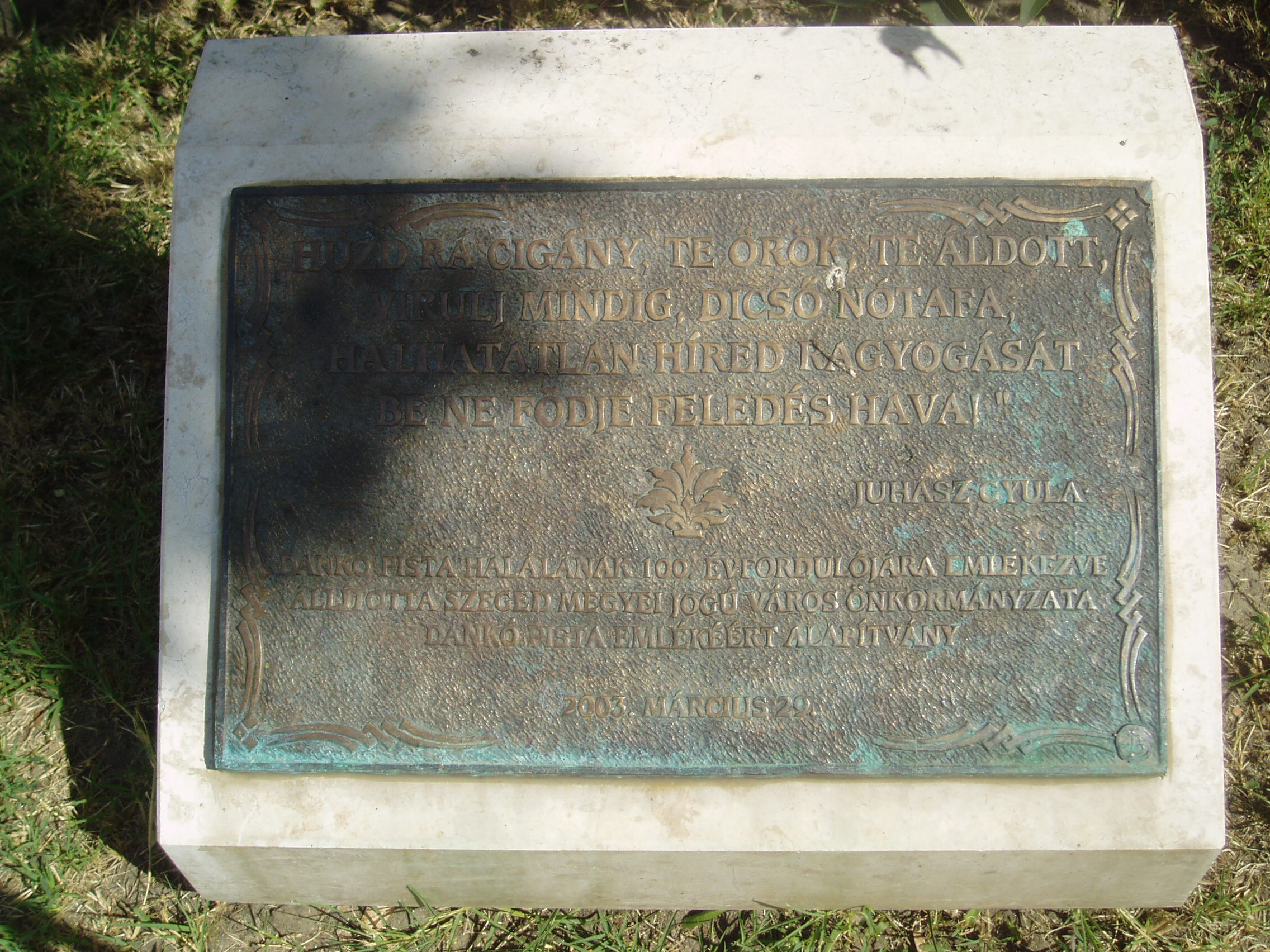 Nyilvános 1131 | 1700 | Szeged, Arany János utca 2. Dankó Pista szobra | Az egykori Kass/Hungária szálló előtt áll Dankó Pista lírai szépségű, romantikus szobra, Margó Ede 1912-ben felavatott alkotása (eredetileg a a Stefánián állították fel, a Tisza-parthoz közeli részen, a színház bejáratának tengelyében). A monolit jellegű, egy darabból faragott szobor markáns festői hatásokkal fejezi ki a dalköltő lelkének mélységeit. A hegedűjét pengető, elmélázó nótaköltő mögé a szobrász nyíló vadrózsabokrot mintázott, vésője nyomán csipkefinom részletek és nagy felületekben lágyan elomló formák teremtik meg a szobor mélabús hangulatát. A nevezetes szobor történetéhez hozzátartozik az a tréfás szegedi anekdota, amely szerint a dalköltő mindannyiszor megpengeti hegedűjét, valahányszor szűz lány megy el előtte… A fénykép 2007 júliusában készült. Felh. irod.: Péter László: Szeged. Bp. Panoráma, 1981 Tóth Attila: Szeged szobrai és muráliái. Szeged, 1993 |