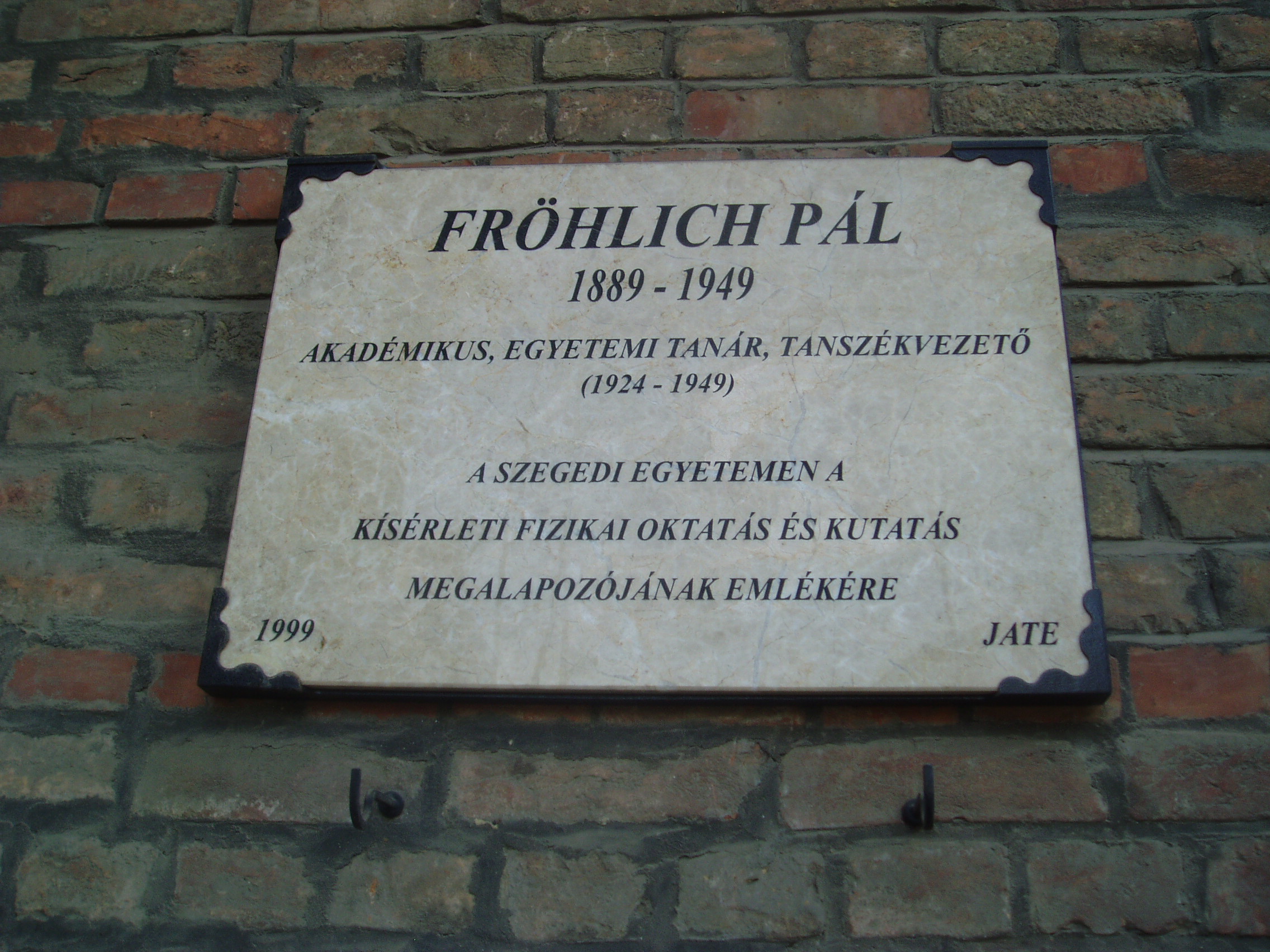 Nyilvános 1091 | 1556 | Szeged, Rerrich tér: Frölich Pál emléktáblája | Az egyetemi épületen 1999-ben helyezték el Frölich Pál (1889-1949) akadémikus emléktábláját, aki 1924 és 1949 között a szegedi egyetem tanszékvezető tanára volt. Ő alapozta meg Szegeden a kísérleti fizikai oktatást és kutatást. Neki volt köszönhető, hogy a második világháború idején a kiürítési parancs ellenére az egyetem alagsorában biztonságba helyezte és befalazta az egyetem kutatási eszközeit, műszereit, amelyek így épségben megmaradtak. A fénykép 2007 júliusában készült. Felh. irod.: Magyarország a XX. században. Szekszárd, Babits Kiadó, 1996-2000. IV. kötet: Tudomány 1. Természettudományok |