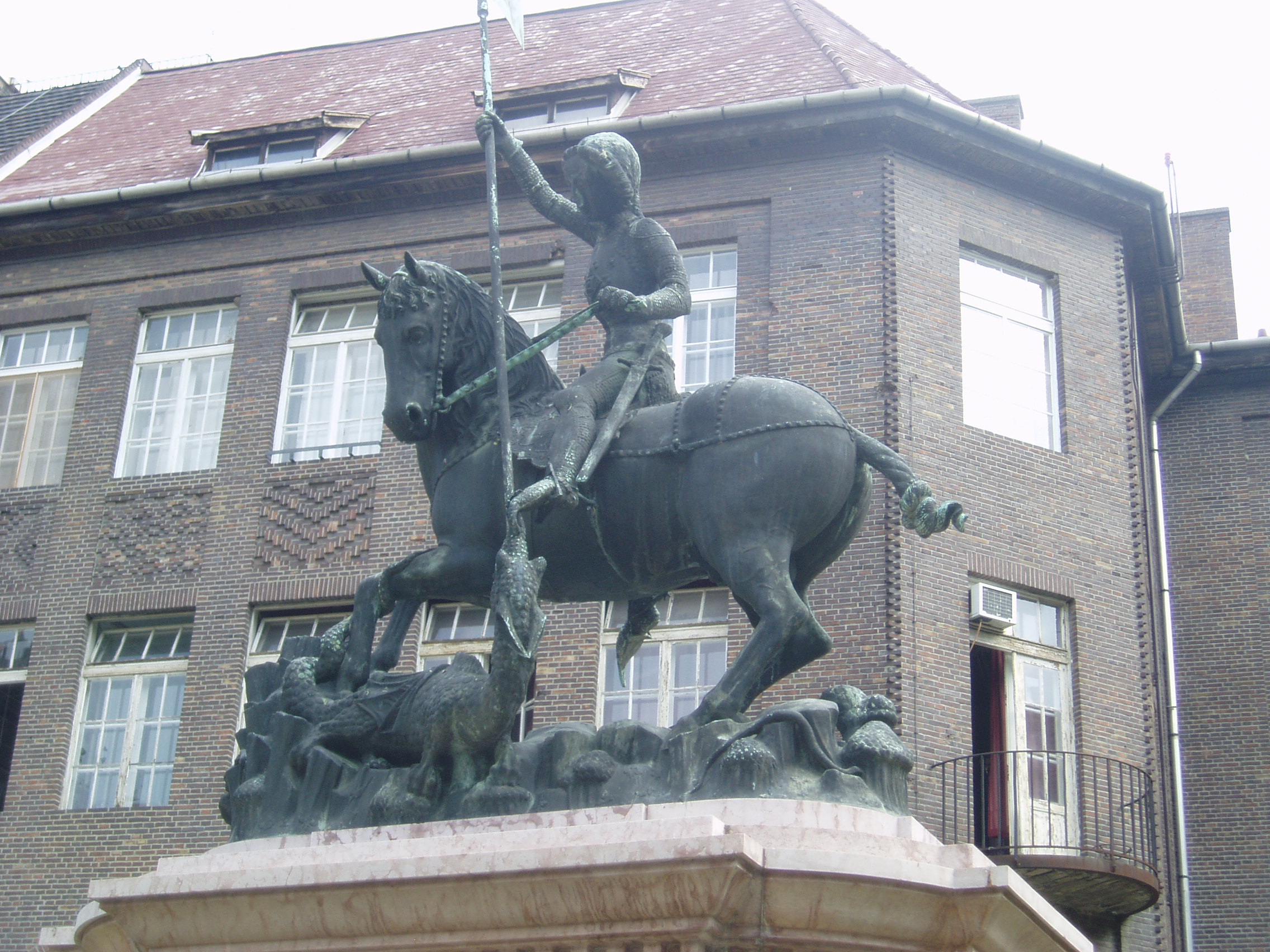 Nyilvános 1193 | 3102 | Szeged, Rerrich tér: Sárkányölő Szent György lovasszobra | A Dóm tőszomszédságában elhelyezkedő kis, intim hangulatú téren állították fel a Kolozsvári-testvérek 1373-ban készített, Szent Györgyöt ábrázoló lovasszobrának másolatát, amelyet Krausz Ferenc öntött 1938-ban Budapesten. A szobor, mely a városnak a nagyhírű kolozsvári egyetemhez való szellemi kötődését jelképezi, Klebelsberg Kunó kultuszminiszternek köszönhetően került Szegedre. Az eredeti műalkotás a prágai vár udvarán, a Hradzsinban látható. A fénykép 2007 júliusában készült. Felh. irod.: Péter László: Szeged. Bp. Panoráma, 1981 http://users.cwi.hu/idegenvezetes |