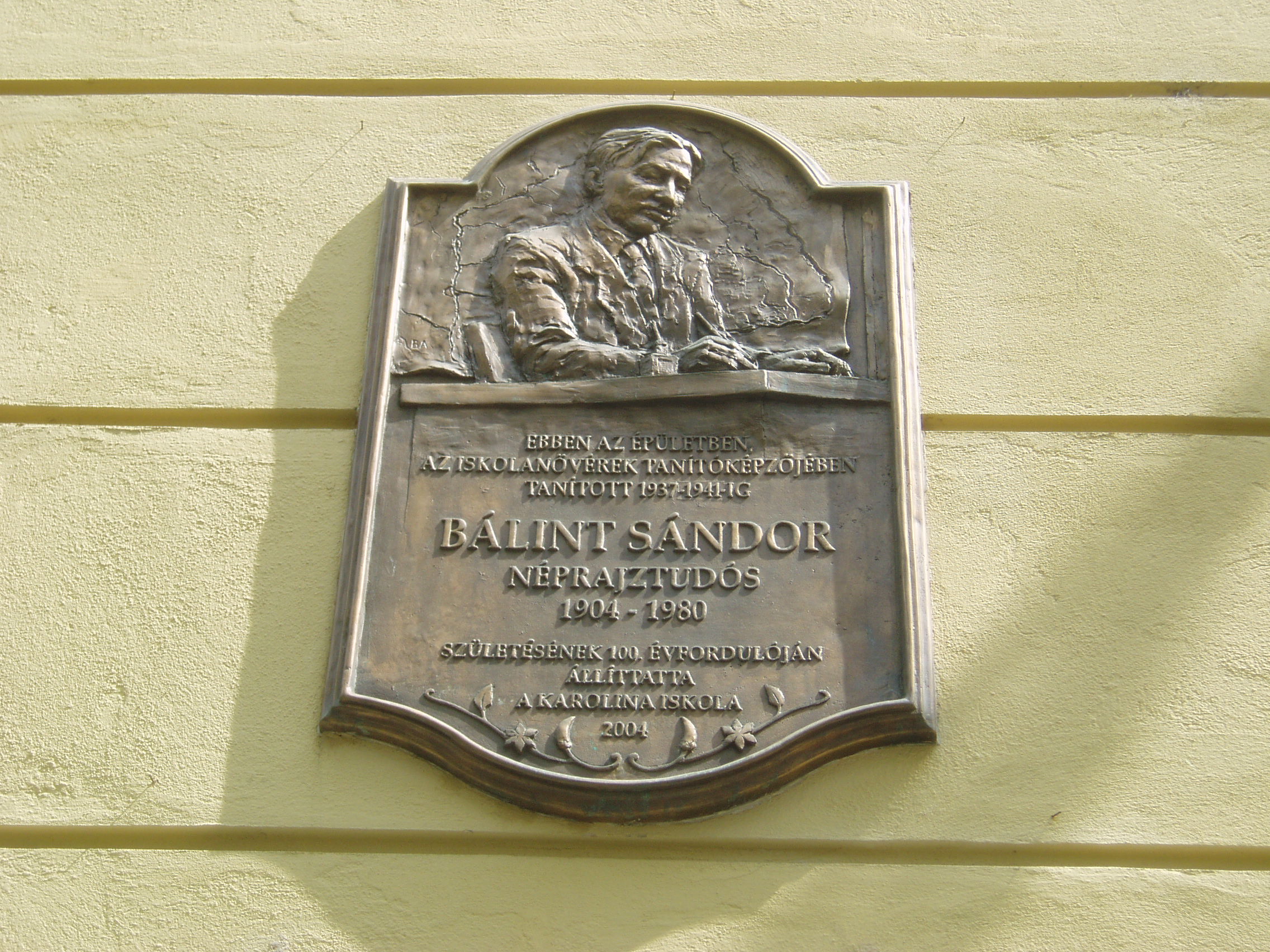 Nyilvános 1115 | 1603 | Szeged, Szentháromság utca 70-76. | Az egyházi Karolina Iskola épületében az elmúlt rendszer idején a Juhász Gyula Tanárképző Főiskola Ének–zene Tanszéke működött. Itt tanított Kardos Pál Liszt–díjas karnagy, aki 1961–1972 között a főiskola leánykarát is vezette. Kardos Pál tanári személyisége, művészi igényessége meghatározóvá vált növendékei és kollégái körében. Emléktábláját 2002. március 22-én avatták fel az épület falán. Az épületen portrédomborműves emléktábla idézi Bálint Sándor néprajztudós (1904–1980), „a legszögedibb szögedi” alakját, aki 1937 és 1941 között az itt működő Iskolanővérek tanítóképzőjének tanára volt. A fénykép 2007 júliusában készült. Felh. irod.: Tizenkét év kőben és ércben. Szeged, Önkormányzat, 2002 |