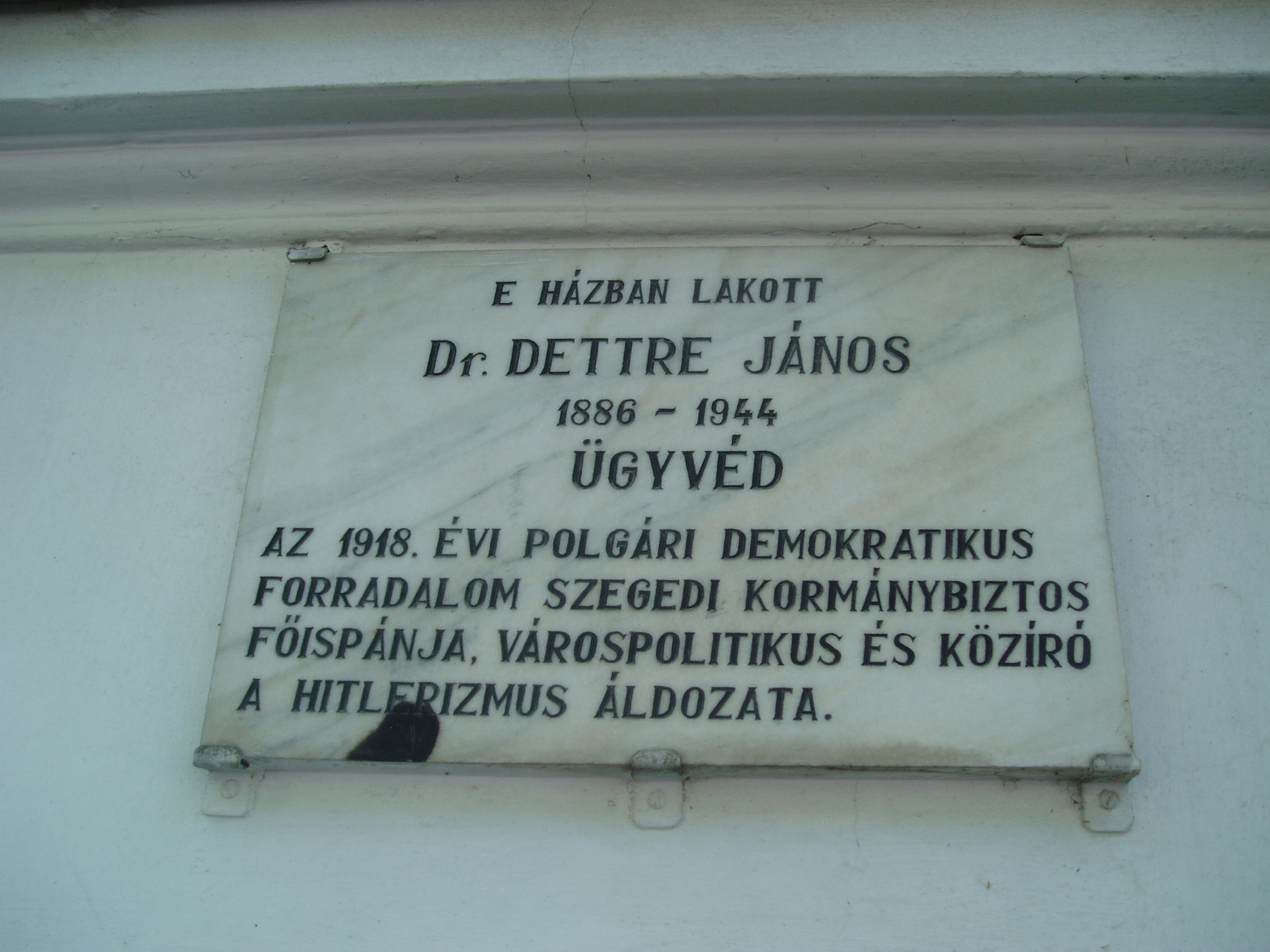 Nyilvános 1132 | 1591 | Szeged, Takaréktár utca 5. | Ebben a házban lakott Detre János (1886-1944) ügyvéd, várospolitikus és közíró. Az őszirózsás forradalom idején előbb a Szegedi Nemzeti Tanács titkára volt, majd Károlyi Mihály kormánya kinevezte Szeged kormánybiztos-főispánjává. Közvetítő, kiegyensúlyozó szerepet igyekezett játszani a bal- és jobboldal, a munkásság és a polgárság, valamint a Város és a franciák között. Szerepe volt benne, hogy Szegeden viszonylag csendesen, súlyosabb kilengések nélkül zajlottak le a forradalmi események. 1920-ban Szabadkára emigrált, ahol a Bácsmegyei Napló munkatársa lett. 1925-ben visszatért Szegedre, ahol a Délmagyarország publicistájaként dolgozott. 1944-ben felesége, Eisenstein Ilona deportálását követően önként vetett véget életének. A fénykép 2007 júliusában készült. Felh. irod.: Lengyel András: Író és "rendszerváltás". Dettre János és Móra Ferenc konfliktusa. = www.sulinet.hu/oroksegtar/data/Muzeumi_kotetek/Csongrad_megye |