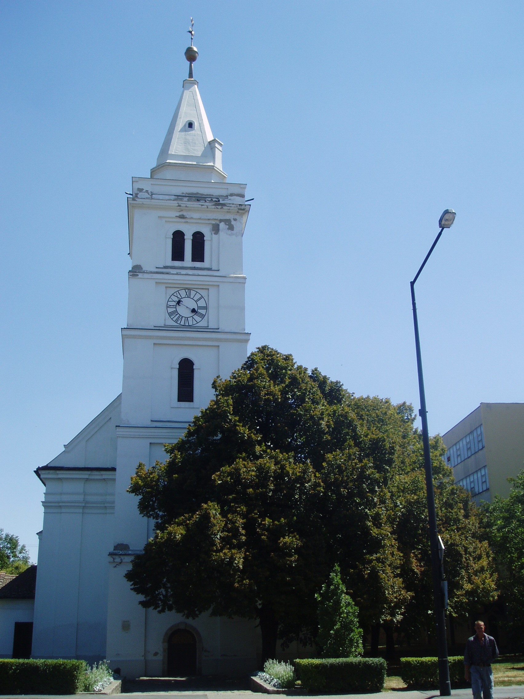 Nyilvános 1536 | 3452 | Hódmezővásárhely, Kossuth tér: Református Ótemplom | A parkosított Kossuth tér a város főtere. Délkeleti sarkán áll a város legrégibb, legjelentősebb műemléke, a református ótemplom és a vele hajdan szerves kapcsolatban álló magtár. Az épület fiókos dongaboltozatú hajója 1721 és 1723 között készült el. Két évtized múlva a templom köré lőréses téglafalat építettek, amelynek keleti és déli szakasza ma is megvan. A toronyban helyezték el a nagyecsedi kastély II. Rákóczi Ferenctől elkobzott óráját, csengettyűjét, amelyeket a város akkori földesura, gróf Károlyi Sándor adott el az egyháznak. A templom hajdan kazettás, festett, stilizált virágmotívumokkal díszített fatáblás mennyezetét és karzatát a budapesti Iparművészeti Múzeum, a papok padját a helyi Tornyai János Múzeum (lásd: Hódmezővásárhely, Szántó–Kovács János u. 16–18.) őrzi. A templom jeles lelkésze volt Szőnyi Benjámin (1717–1794). Megválasztása után, 1743-ban külföldi tanulmányútra ment: az Odera–menti Frankfurt, Leyden és Utrecht egyetemein hallgatott teológiát. Hazaérkezése után csaknem ötven évig működött ebben a templomban. Országos elismerést szerzett teológiai témájú könyveivel, valamint számos kiadást megért "Szentek hegedűje" című énekeskönyvével. Feliratos sírköve — epitáfiuma — az épület külső falánál látható. A fénykép 2007 júliusában készült. Felh. irod.: Barangolások Csongrád megyében. Miskolc, Well-PRess, 1997 /Vendégváró/ Arató László - Batyi Zoltán: Hódmezővásárhely az alföldi művészváros. Hódmezővásárhely, 2004 |