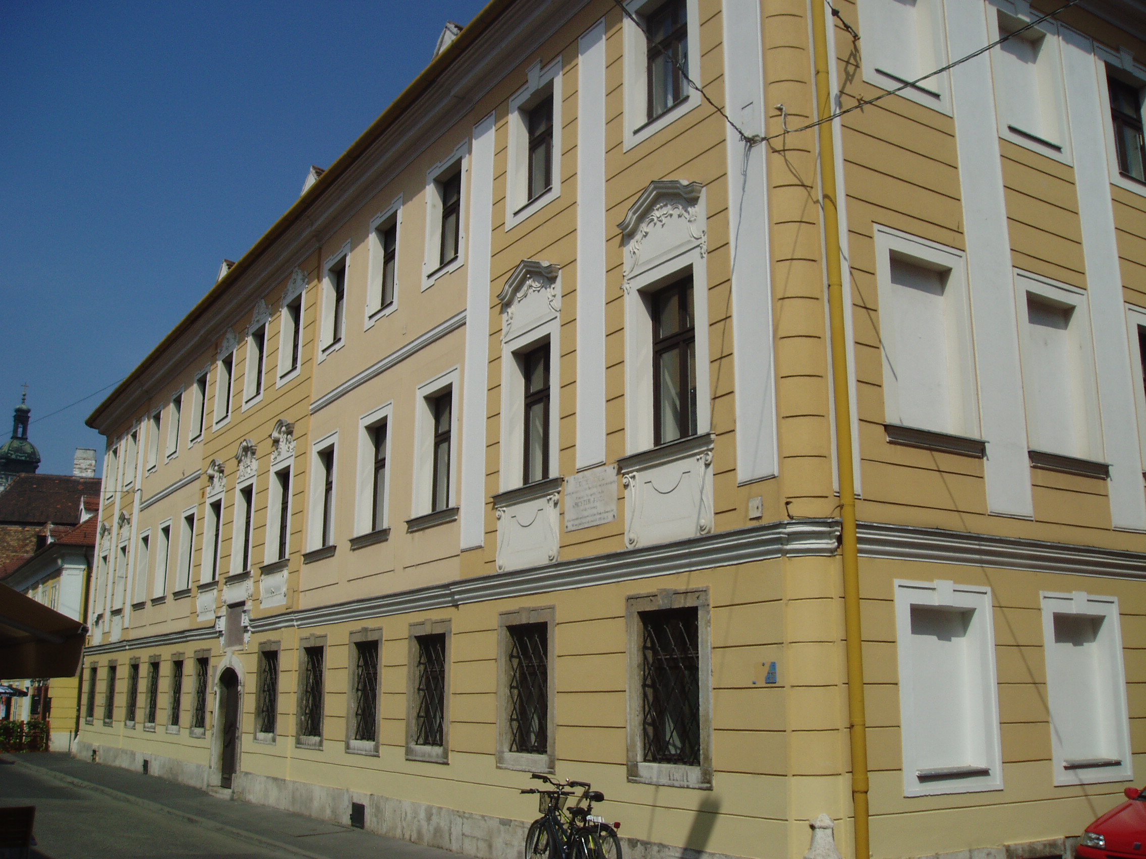 Nyilvános 1253 | 1902 | Győr, Apáca utca 5. Káptalani zenészek háza | A XVI. század első felében ezen a telken a városháza állott. Abban rendezték be a a székeskáptalan által fenntartott XVI–XVII. századi „magyar iskolát”, amelyet káptalandombi otthonából a német katonaság üldözött el. Az ekkor már kétemeletes épület az iskola mellett a székesegyházi (lásd: Győr, Káptalandomb: Székesegyház) muzsikusoknak is otthona lett, mint a Káptalani zenészek háza. Lakott benne Istvánffy Benedek, aki 1778 előtt működött a székesegyház zenei vezetőjeként, majd 1832 és 1854 között itt lakott Richter Antal. Felesége nagyszerű énekesnő volt. 1843. április 4-én ebben a házban született fiuk, Richter János (Hans Richter), a későbbi legendás Wagner–karmester. A felvétel 2008 május végén készült. Felh. irod.: Cziglényi László: Győr. Bp. Panoráma, 1981 Orbánné Horváth Márta: Emlékművek, emléktáblák győri kislexikona. Győr, Városi Könyvtár, 2001 Vavrinecz Veronika: Richter Antal (1802–1854) élete és működése. 2003, Szkarabeusz Kiadó |