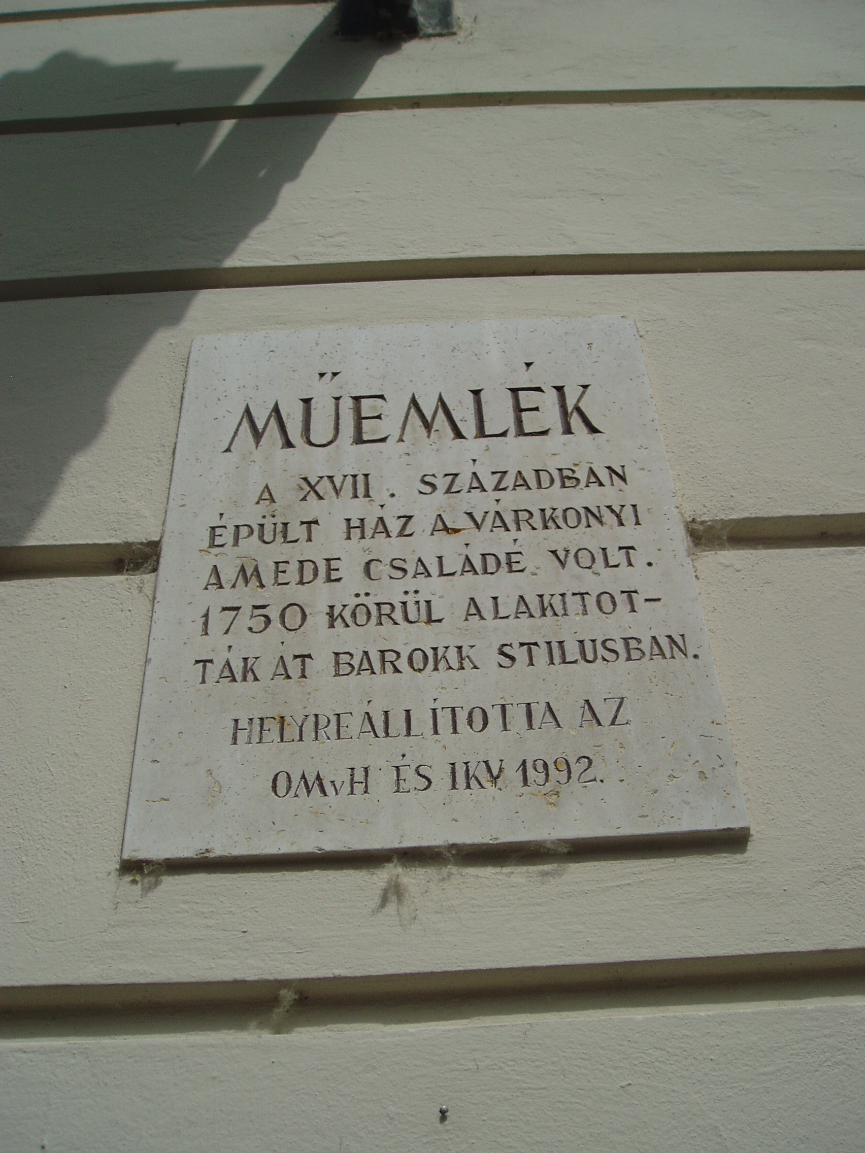 Nyilvános 1210 | 1670 | Győr, Bécsi kapu tér 4. | Európa legszebb barokk terei egyike a győri Bécsi kapu tér, amely nevét az 1860-ban lebontott nagytömegű, olaszos stílusú városkapuról kapta. A 4. számú épület a XVII. században épült, a rajta lévő műemléki tábla szerint a várkonyi Amede családé volt. Egy másik emléktábla arról tudósítja a sétálót, hogy ebben a házban élte át a város 1945-ös ostromát Borsos Miklós (1906-1990) szobrászművész, aki 1922 és 1947 között Győrben élt és alkotott (lásd még: Győr, Apor Vilmos püspök tere 2.). A felvétel 2008 május végén készült. Felh. irod.: Cziglényi László: Győr. Bp. Panoráma, 1981 |