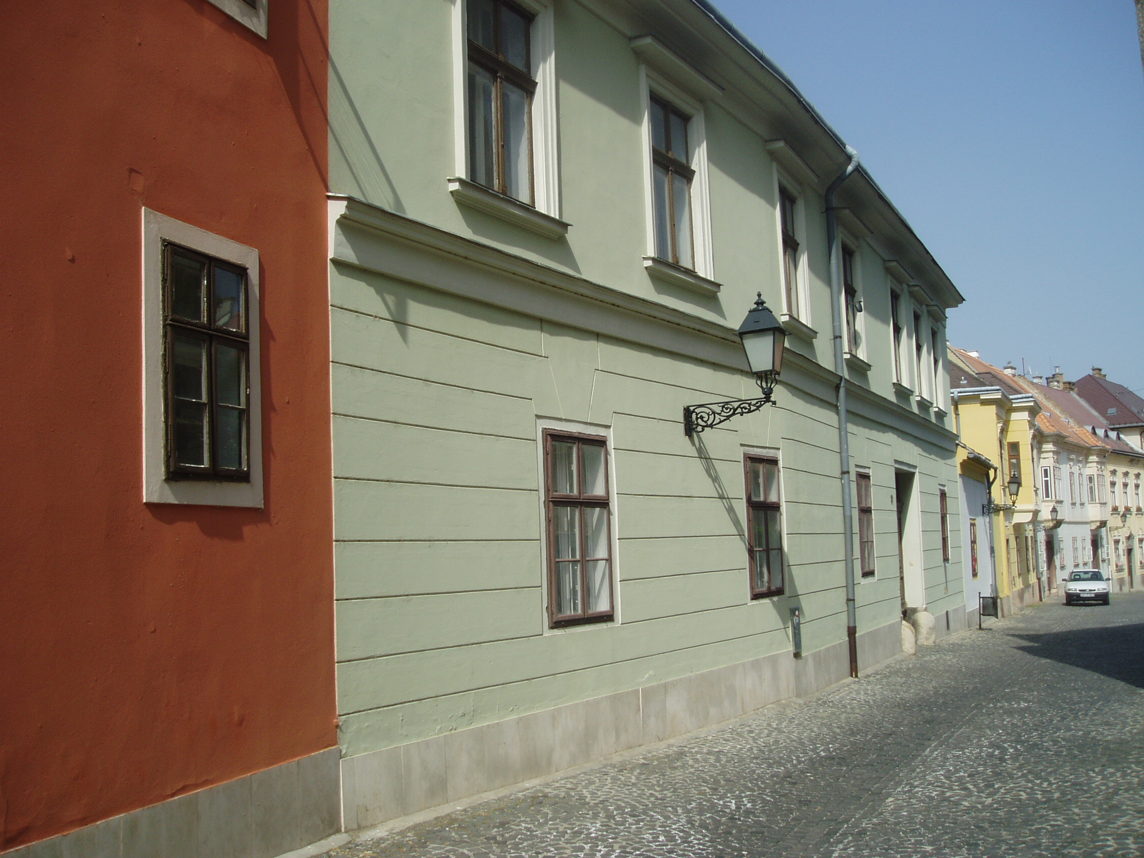 Nyilvános 1138 | 2046 | Győr, Káptalandomb 11. | A székesegyház apszisától kelet felé sétálva, a dombtetőről levezető út mentén találjuk a Káptalandomb legértékesebb műemlékházait. A 11. számú egyemeletes, klasszicista stílusú épület, mai homlokzata az 1800-as évek elején készült. A felvétel 2008 május végén készült. Felh. irod.: Cziglényi László: Győr. Bp. Panoráma, 1981 |