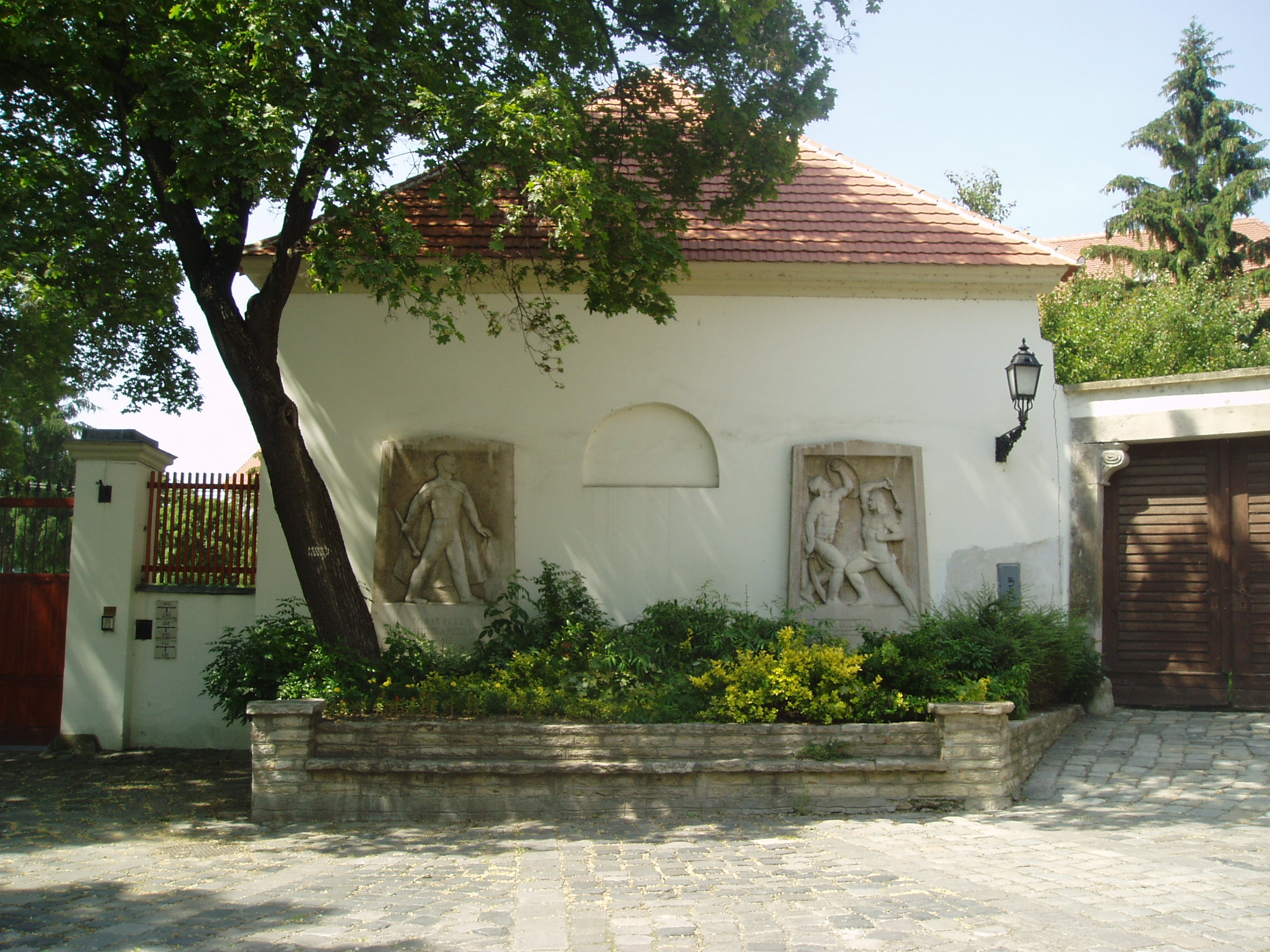 Nyilvános 1178 | 1735 | Győr, Káptalandomb: Eörsy Péter és Pálffy Miklós emlékművei | A Püspökvár előtti kis házon - sajnos, házszámot nem visel - Győr két hősét jelenítik meg Nagy Sándor domborművei. Pálffy Miklós és Eörsy Péter a török elleni küzdelem szereplői voltak. Miután 1594-ben Szinán pasa elfoglalta Győrt, 1598. március 29-én Pálffy Miklós komáromi főkapitány, a kor egyik legkiválóbb magyar hadvezére és Schwarzenberg Adolf, a bécsi várőrség parancsnoka egy akkor még kevéssé ismert harci eszköz, a petárda segítségével a déli, ún. Fehérvári-kaput berobbantotta és másfél napos harc után Győrt visszafoglalta. Eörsy Miklós szintén tevékeny szerepet játszott az eseményekben. A szegénység és a névtelenség sorából került ki, és maga küzdötte föl magát a nemesi rend legendás hősévé. Sok hadakozása mellett a legvéresebb harca a törökkel Győrött volt 1598-ban, ahol ezer vízi és szárazföldi hajdú élén küzdött. A felvétel 2008 május végén készült. |