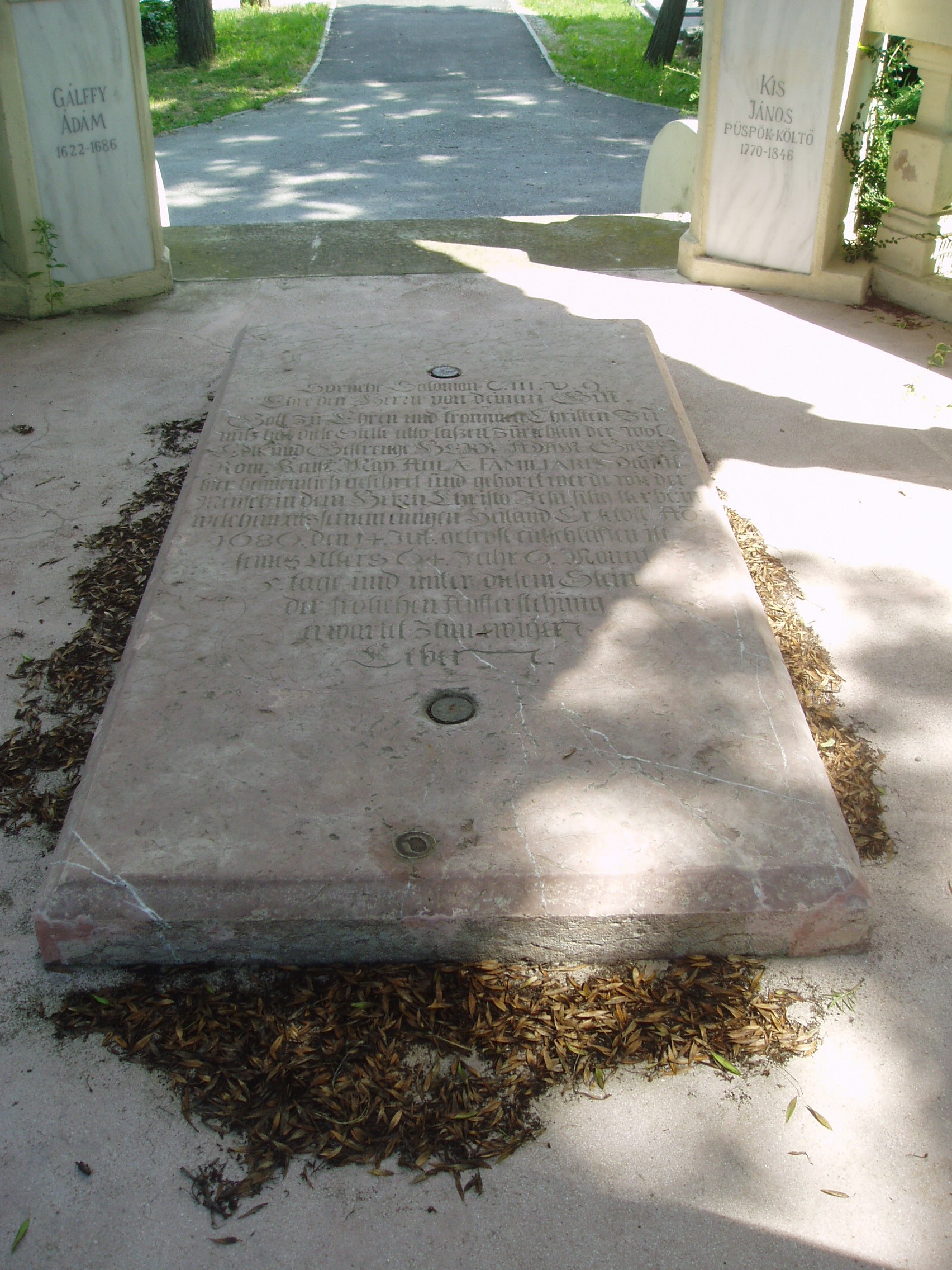 Nyilvános 1181 | 1872 | Sopron, Balfi út. Evangélikus temető. Gálffy Ádám sírboltja | A soproni evangélikusok 1674-ben nyitották meg temetőjüket, korábban a katolikusokkal együtt a Szent Mihály temetőbe temetkeztek. Az 1686-ban elhunyt Gálffy Ádám mellett ide temették az evangélikus egyház nevesebb lelkészeit is: a történetíró Gamauf Teofilt és Kis János költőt. A sírbolt egy hatszögletes, nyitott csarnok, amelyet kőkorlát szegélyez, ezen oszlopok emelkednek. Az építményt cseréptető fedi. Padlójában,amelyhez néhány lépcsőfok vezet, Gálffy epitáfiuma látható. Gálffy Ádám gazdag soproni polgár, földbirtokos, kereskedő volt, aki nagyértékű kegyszergyűjteményt ajándékozott az evangélikus gyülekezetnek. A fénykép 2008 júniusában készült. Felh. irod.: Czellár Katalin: Sopron. 3. jav. kiad. Bp. Panoráma, 2000 |