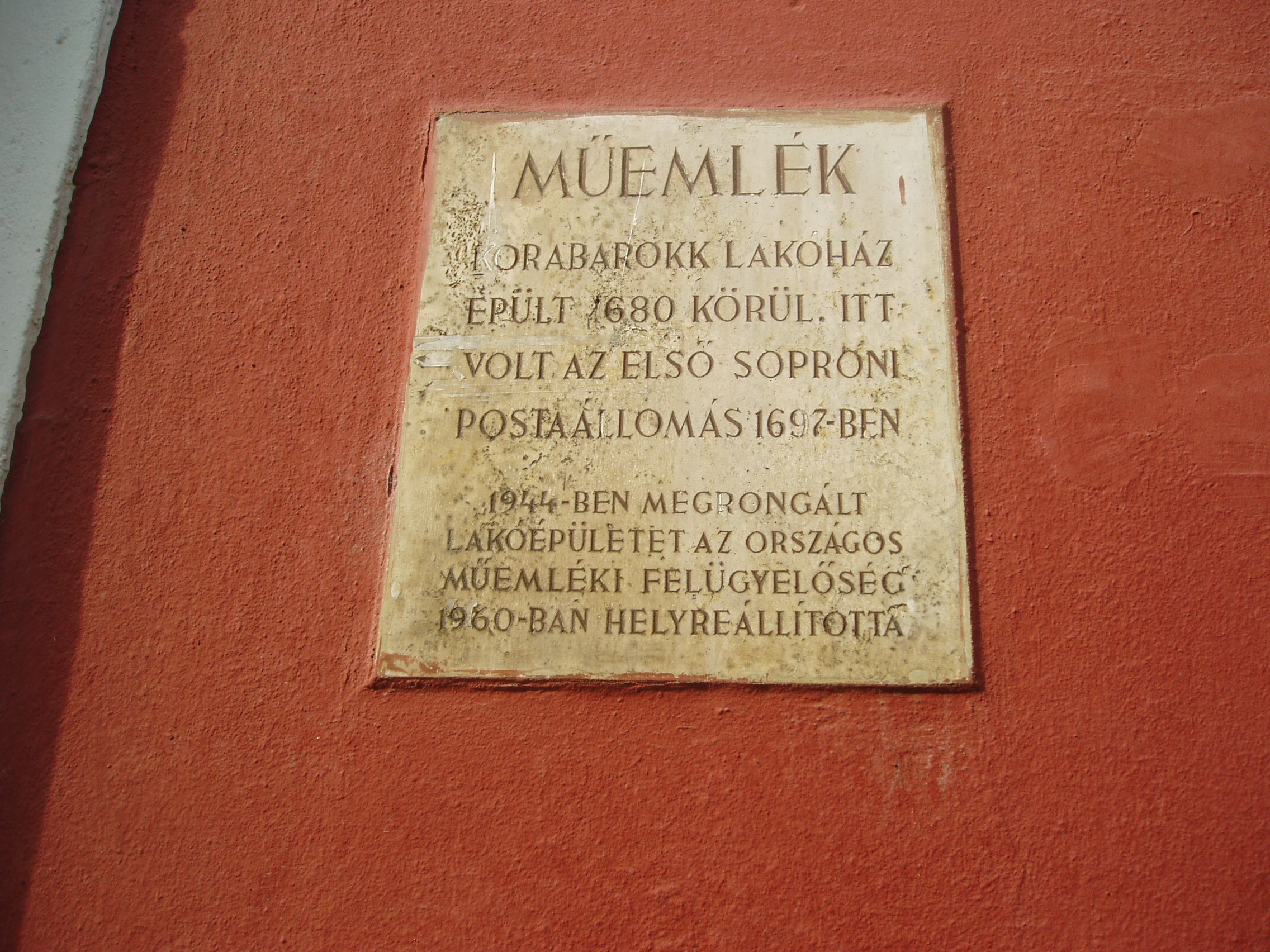 Nyilvános 1144 | 1623 | Sopron, Fegyvertár utca 23. | A belvárosban, a Templom utca 21. szám után balra nyílik a rövid Fegyvertár utca. A 23. számú, 1680 körül korabarokk stílusban épült ház várostörténeti jelentősége, hogy 1697-ben itt volt az első postaállomás. A fénykép 2008 júniusában készült. Felh. irod.: Czellár Katalin: Sopron. 3. jav. kiad. Bp. Panoráma, 2000 |