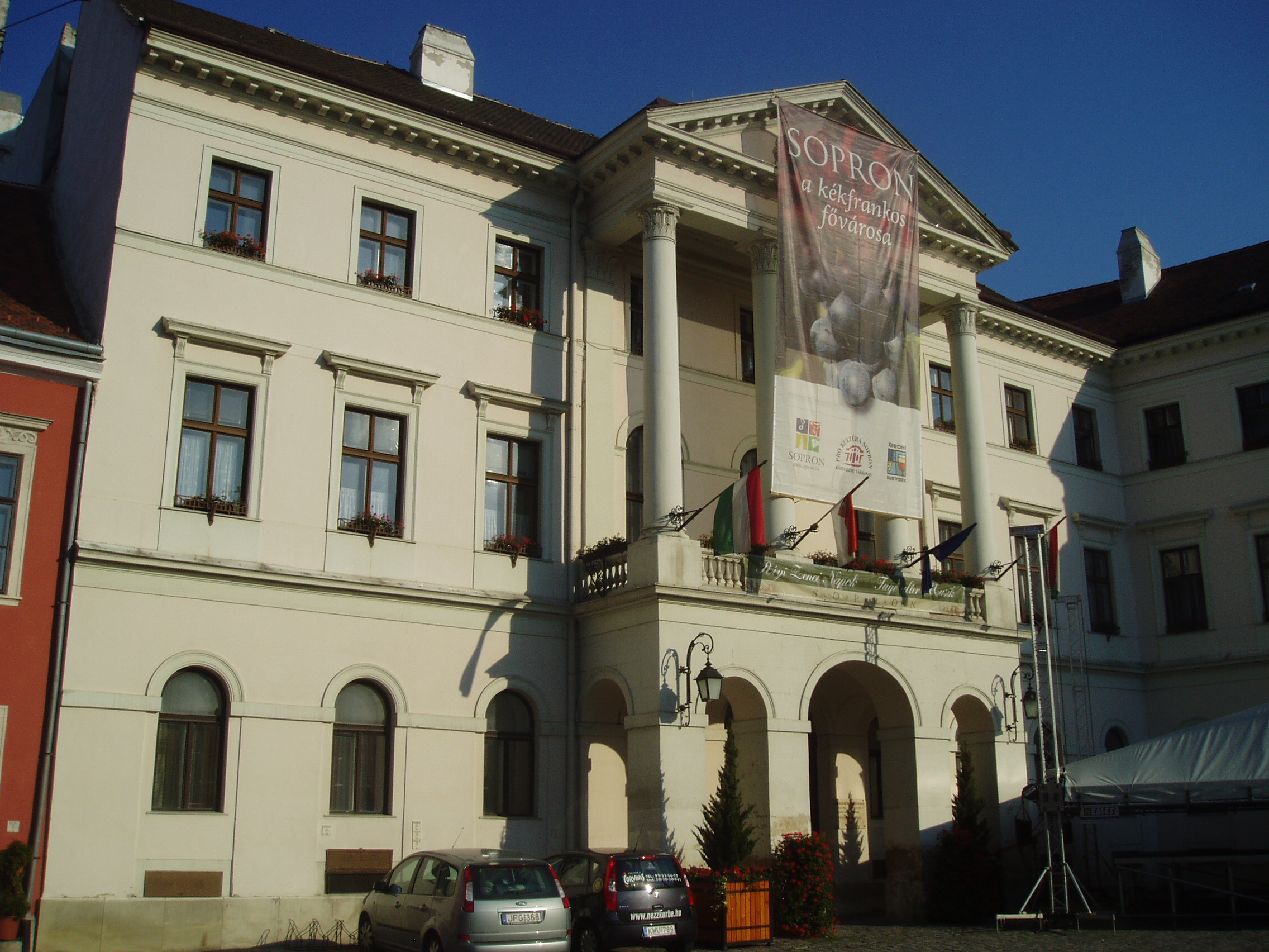 Nyilvános 1189 | 1669 | Fő tér 5. A volt Megyeháza | Az épületet két korábbi, lebontott ház helyén 1828 és 1834 között emelték Hild Vencel tervei szerint egyszerű, klasszicista stílusban. Korabeli berendezése a második világháború idején nagyrészt elpusztult. A homlokzat nyitott erkélye feletti oromzatban Sopron vármegye címere látható, amelyet Kisfaludi Strobl Zsigmond készített 1919-ben az 1894-ből származó régi helyett. Ebben az épületben van a város levéltára. A kép 2008 júniusában készült. Felh.irod.: Czellár Katalin: Sopron. 3. jav. kiad. Bp. Panoráma, 2000 |