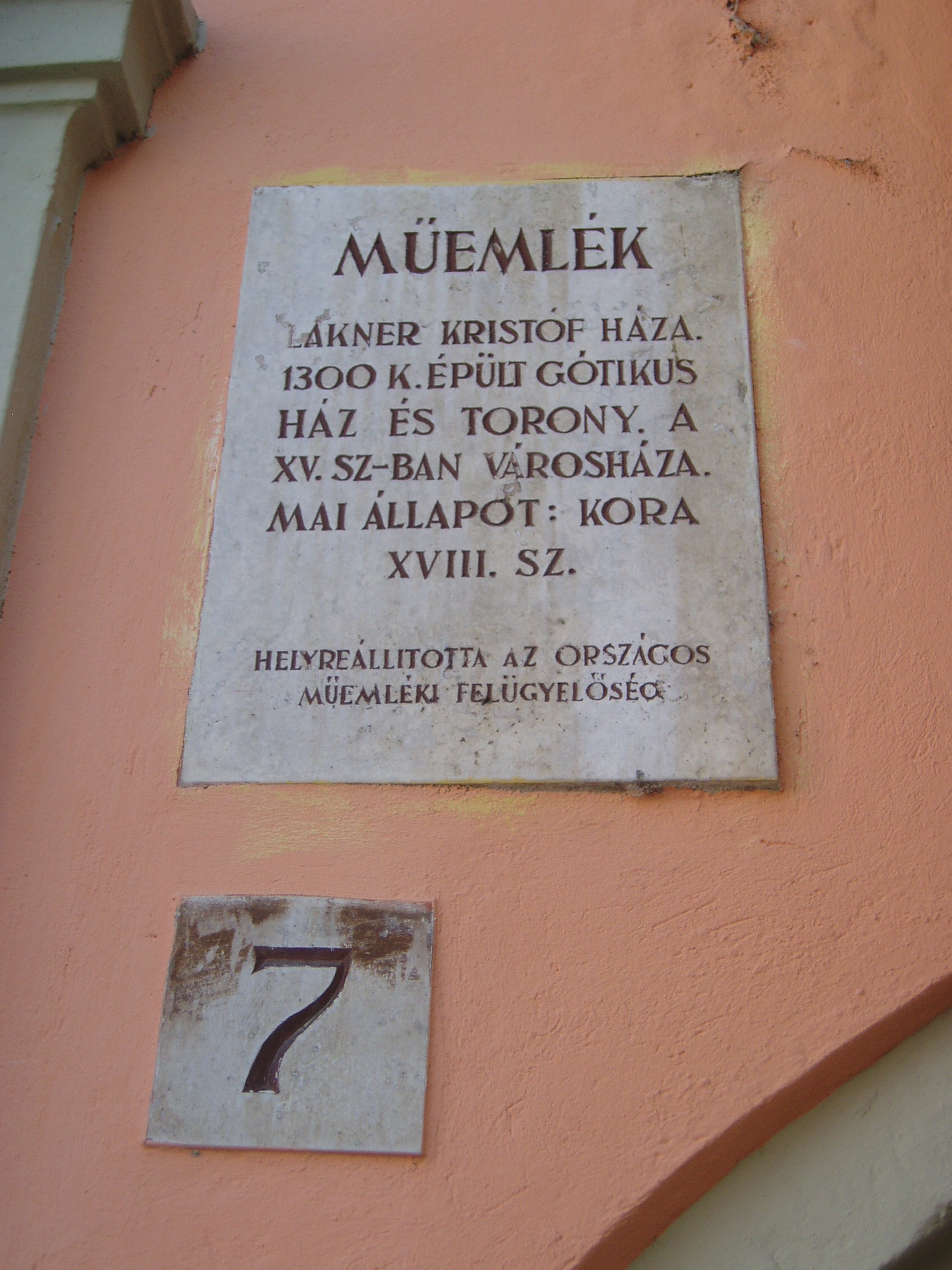Nyilvános 1169 | 1534 | Fő tér 7. Lackner-ház vagy Tábornok-ház | Udvari, keleti szárnya és a toronyhoz csatlakozó háromszintes rész a XV. században épült. A XVII. század elején a legendás polgármester, Lackner Kristóf tulajdona volt. Ebből az időből származhat főhomlokzata. 1631-ben bekövetkezett halálával Lackner kívánságára a városra szállt, azóta is többször átépítették, illetve tűzvész okozta károk után helyreállították. A főhomlokzat előtti klasszicista erkély 180-ból származik. Ide szállásolták el egykor Sopron katonai parancsnokait, másik nevét erről kapta. A kép 2008 júniusában készült. Felh.irod.: Czellár Katalin: Sopron. 3. jav. kiad. Bp. Panoráma, 2000 |