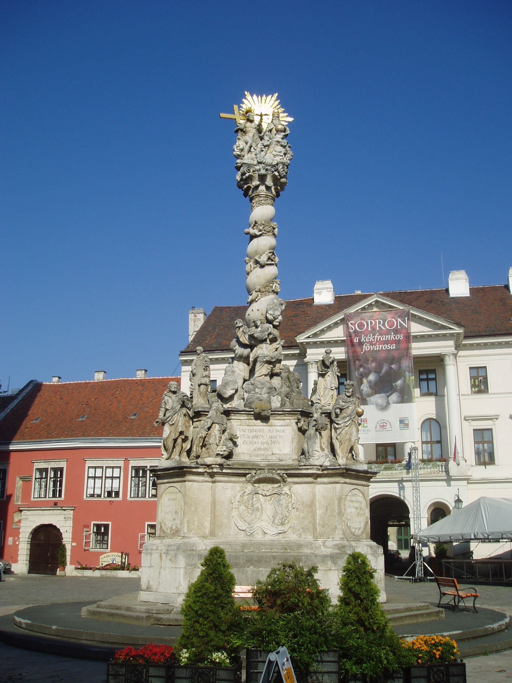 Nyilvános 916 | 1225 | Sopron, Fő tér: Szentháromság oszlop | A Fő téren áll a Szentháromság szobor, amely a magyarországi barokk szobrászat egyik legkiemelkedőbb alkotása. 1695 és 1701 között készült Thököly Katalin és harmadik férje, Löwenburg Jakab alapítványából. Az évszázadok során többször restaurálták. Talapzata három, egymásra állított, íves oldalú négyzetes hasábból áll. A másodikon az adományozó házaspár, valamint négy szent alakja helyezkedik el. Felhőcsomókon emelkedik a korinthoszi fejezetes csavart oszlop, amelyet virágfüzérek közt lebegő angyalkák díszítenek. Az oszlopfőt a Szentháromság csoportja koronázza. Az oszlop aljánál Immaculata-szobor és szentek alakjai állnak. A fénykép 2008 júniusában készült. Felh. irod.: Czellár Katalin: Sopron. 3. jav. kiad. Bp. Panoráma, 2000 |