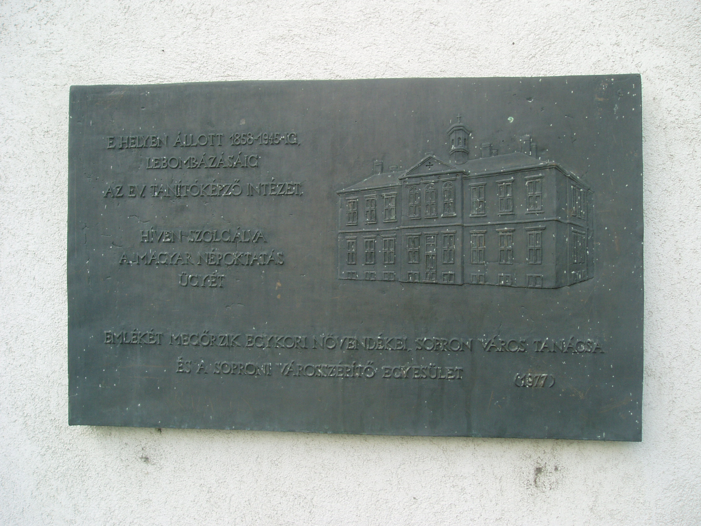 Nyilvános 1159 | 1415 | Sopron, Frankenburg utca 24. | A Frankenburg utca és a Deák tér sarkán állt egykor soproni evangélikus tanítóképző intézet. A modern utódépületen elhelyezett emléktáblán az 1945-ben lebombázott iskolaépület ábrázolása látható. A fénykép 2008 júniusában készült. |