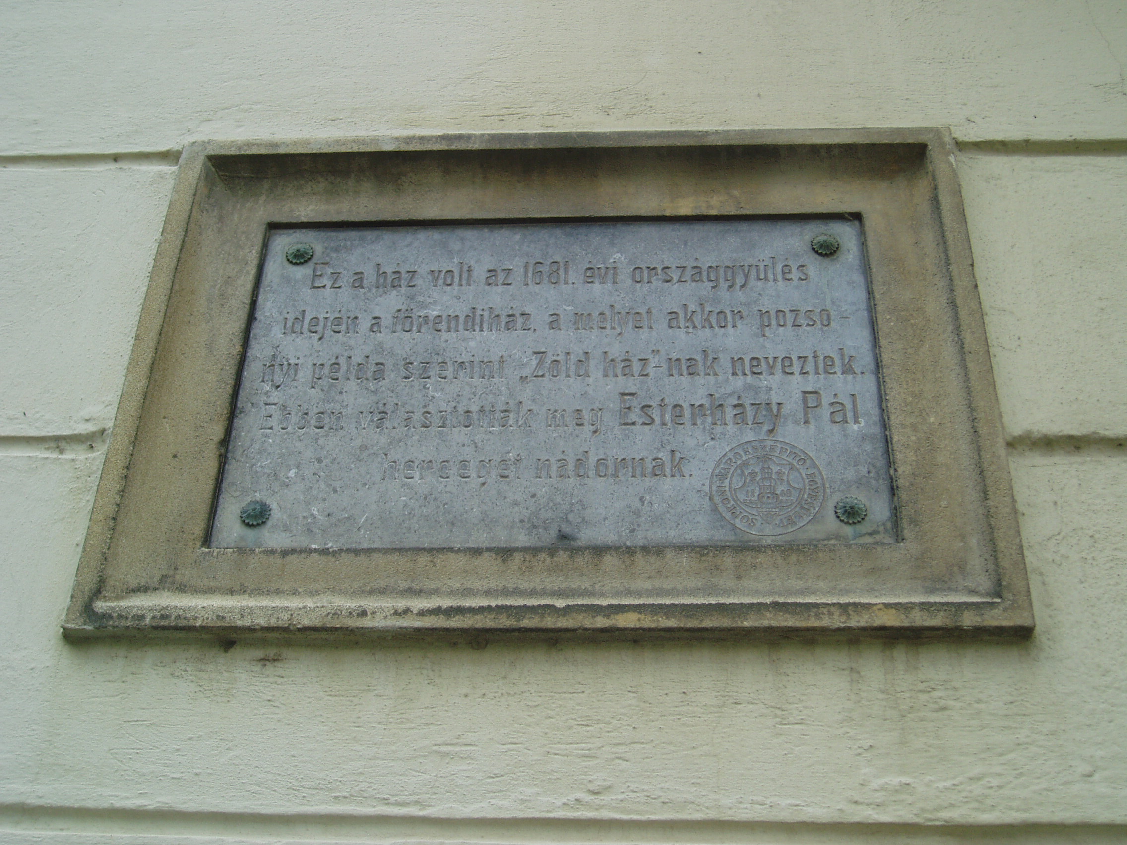 Nyilvános 1083 | 1418 | Sopron, Hátsókapu 2. | Az ún. Caesar–ház hatalmas reneszánsz sarokerkélyével a városkép jellegzetes eleme. Helyén valamikor több kisebb, valószínűleg a XV. században épült lakóház állt. Az 1676-ban Sopron belvárosát sújtó nagy tűzvész után ezek megmaradt részei, valamint a belső városfal maradványainak felhasználásával épült fel e pompás kis városi palota. Dongaboltozatos kapualjában megmaradtak a középkori ülőfülkék. Udvari szárnyának emeletén toszkán oszlopos, köríves árkádsor van. Az udvarból a falszorosban kialakított kertbe juthatunk, ahol látható a római és a ráépült középkori városfal, amelyet ablakokkal áttörve az épület hátsó homlokzataként használtak fel. Két emeleti termében megmaradt az 1700 körül készült, kora barokk ornamentális stukkómennyezet. Az 1681-es országgyűlés idején ebben az épületben ülésezett a főrendiház, ekkor választották Magyarország nádorává Esterházy Pál herceget, aki Harmonia caelestis című kantátasorozatával beírta nevét a magyar zenetörténetbe is. Az eseményt a Soproni Városszépítő Egyesület körpecsétjével ellátott emléktábla örökíti meg az épület homlokzatán. A fénykép 2008 júniusában készült. Felh. irod.: Czellár Katalin: Sopron. 3. jav. kiad. Bp. Panoráma, 2000 |