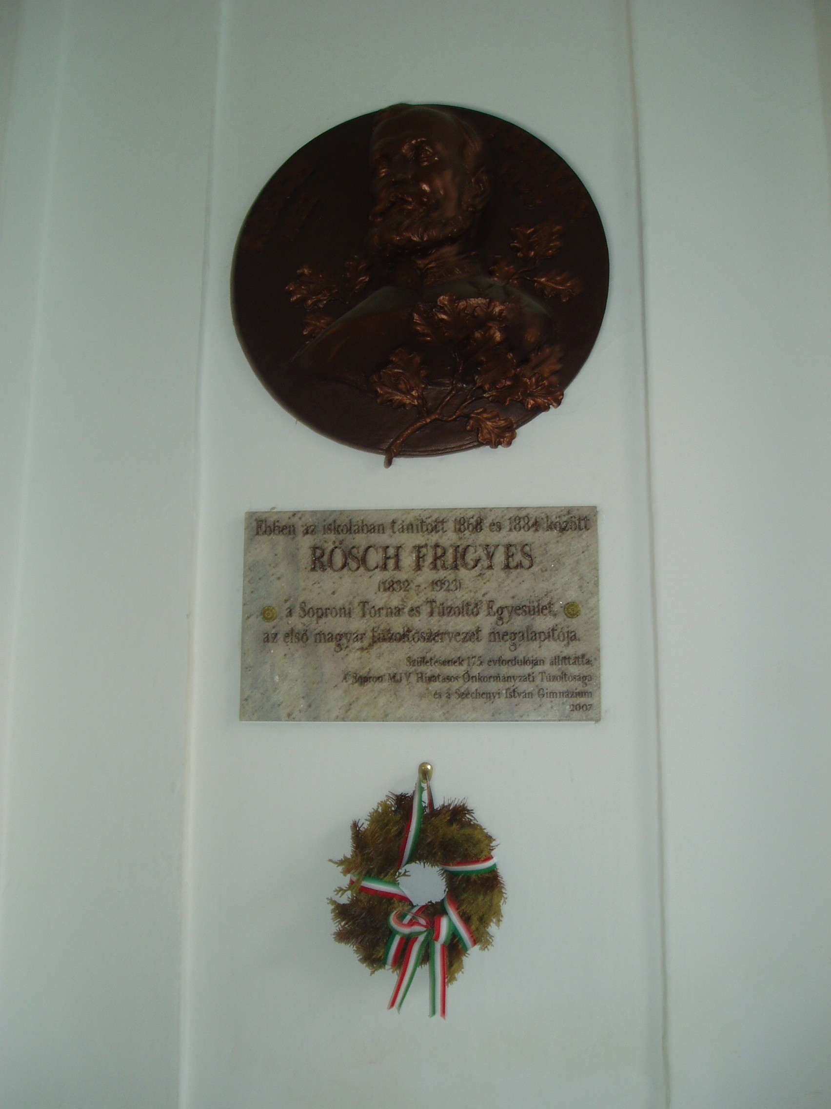 Nyilvános 1163 | 1663 | Sopron, Liszt Ferenc utca 1. | A Széchenyi István Gimnázium eredetileg reáliskola volt, amelyet 1850-ben alapítottak (lásd: Liszt Ferenc utca 2.). A Liszt Ferenc utca sarkán álló épületrészét, amelynek ezen a képen az udvari része látható, 1872-ben építették. A képen látható emléktáblát Rösch Frigyes (1832-1923) emlékére állították, aki 1868 és 1884 között itt tanított. Ő alapította meg a Soproni Torna és Tűzoltó Egyletet. A fénykép 2008 júniusában készült. Felh. irod.: http://szig.sopron.hu/ |
