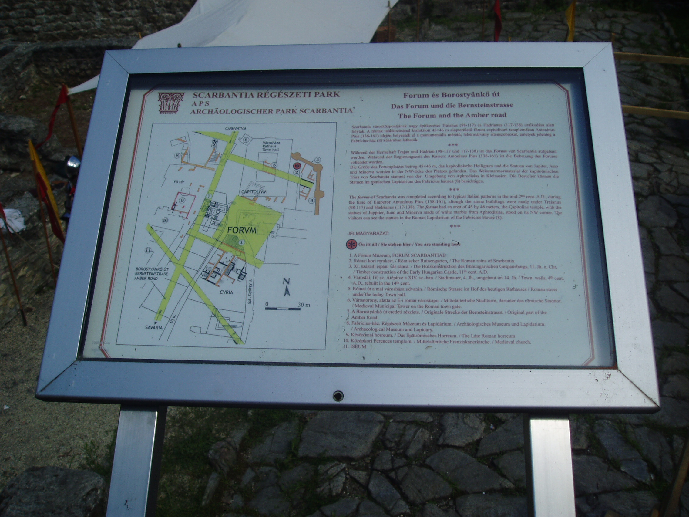 Nyilvános 1051 | 1450 | Sopron, Scarbantia Régészeti Park | Az egykori Római Birodalom Pannónia provinciájának egyik határállomása Scarbantia, a mai Sopron volt. A római oppidum központjának, a fórumnak legfontosabb épületét - a capitoliumi templomot - 1893 telén a városháza építésekor találták meg. Az 1960- és 1970-es évek ásatásaival végül sikerült meghatározni a fórum teljes kiterjedését és elhelyezkedését. A mai belváros szívében feltárt maradványokat - kiegészítve a a XI. századi ispáni vár feltárt sáncával - nagyszabású szabadtéri régészeti kiállítás keretében, térképekkel, ismertetőszövegekkel kellően ellátva szemlélheti meg a városnéző. A kép 2008 júniusában készült. |