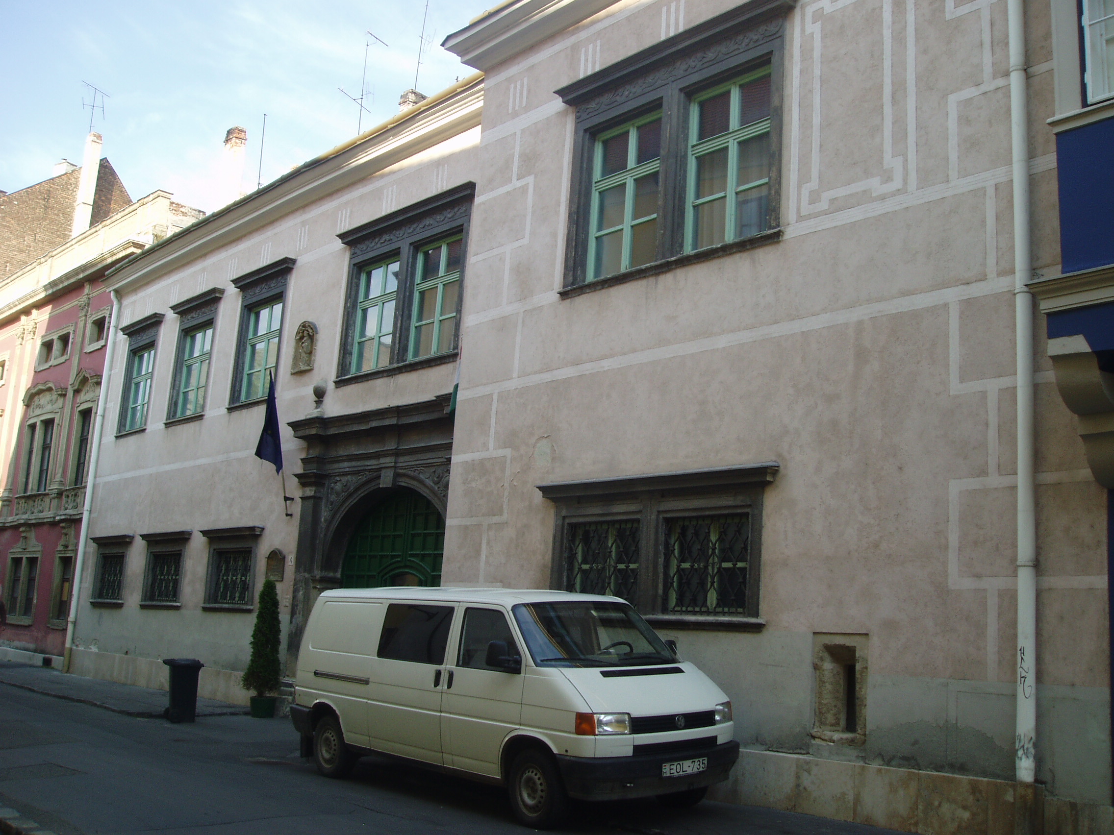 Nyilvános 1100 | 1441 | Sopron, Templom utca 4. Esterházy-palota | A Templom utca 2. számú házhoz hasonlóan ez a középkori eredetű épület is az Esterházy család tulajdona volt 1614-től egészen 1945-ig, előtte pedig Oláh Miklós, a neves humanista érsek családjáé volt. A XVII. századból a kapu és az udvari loggia őrződött meg; homlokzata, amely mintegy folytatása a másik Esterházy–palotának, a XVIII. század közepéről származik. Ebben az épületben állapították meg 1921-ben az antanthatalmak megbízottjai a Sopron és környékének sorsát eldöntő népszavazás eredményét. Az evangélikus templom harangozója hallotta meg elsőként a polgárok közül a jó hírt, s ő kezdte el örömében a harangozást, amihez azután Sopron többi temploma is csatlakozott. A kép 2008 júniusában készült. Felh. irod.: Czellár Katalin: Sopron. 3. jav. kiad. Bp. Panoráma, 2000 |