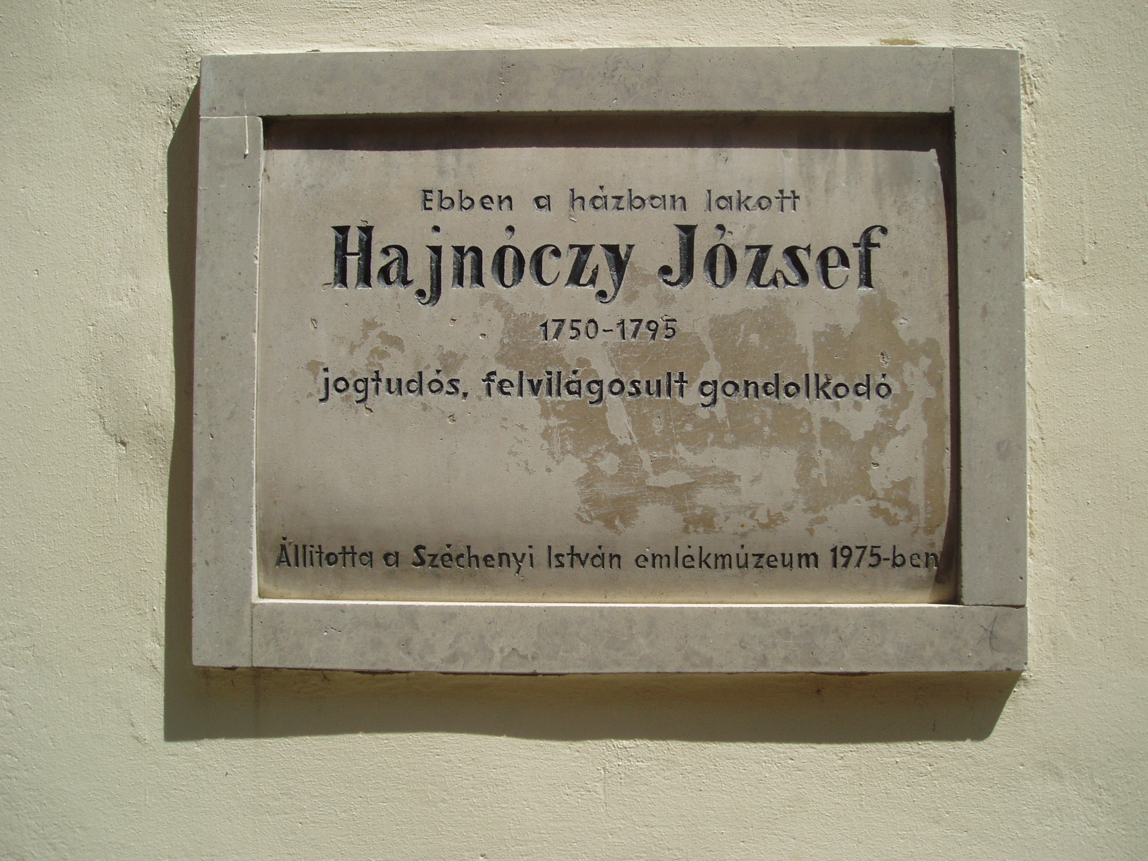 Nyilvános 1119 | 1468 | Sopron, Templom utca 19. | Középkori eredetű, egyszerű, egyemeletes lakóház. 1734-ben Hajnóczy Dániel, a neves tanár és hitszónok tulajdona volt. Az épületen emléktábla hirdeti, hogy ebben a házban lakott Hajnóczy József (1750-1795) jogtudós, felvilágosult gondolkodó. Apja Hajnóczy Sámuel evangélikus lelkész volt. Hajnóczy részt vett a Martinovics-féle összeesküvésben, amiért Budán lefejezték. A kép 2008 júniusában készült. Felh. irod.: Czellár Katalin: Sopron. 3. jav. kiad. Bp. Panoráma, 2000 |