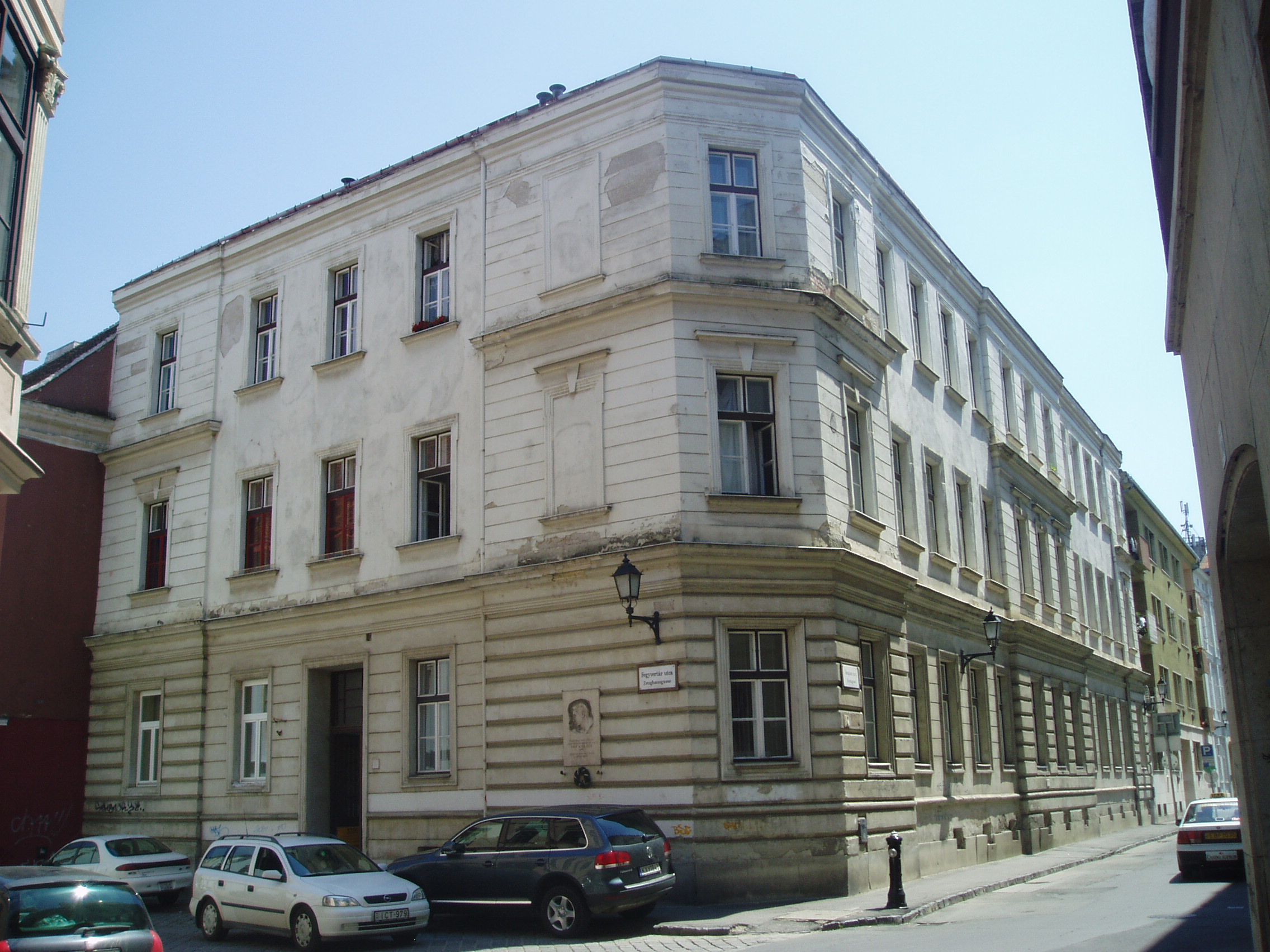 Nyilvános 1128 | 1870 | Templom utca 23. | Egykor ezen a helyen állt a neológ zsinagóga, amelyet Schámár János épített neoreneszánsz stílusban. Első és utolsó rabbija dr. Pollák Miksa (1868-1944) volt, aki történészként megírta a soproni zsidóság történetét. A mostani lakóházat Winkler Oszkár tervezte, 1960-ban épült fel. A neológ zsinagóga emléktáblája mellett az épületen egy másik tábla Pap Károly író alakját idézi fel, aki 1897. szeptember 24-én itt született, Pollák Miksa fiaként. A magyar irodalom egyik legeredetibb hangú prózaírója a buchenwaldi haláltáborban pusztult el. A kép 2008 júniusában készült. Felh. irod.: Czellár Katalin: Sopron. 3. jav. kiad. Bp. Panoráma, 2000 Hegedűs Géza: A magyar irodalom arcképcsarnoka. Bp. Trezor, 1992 |