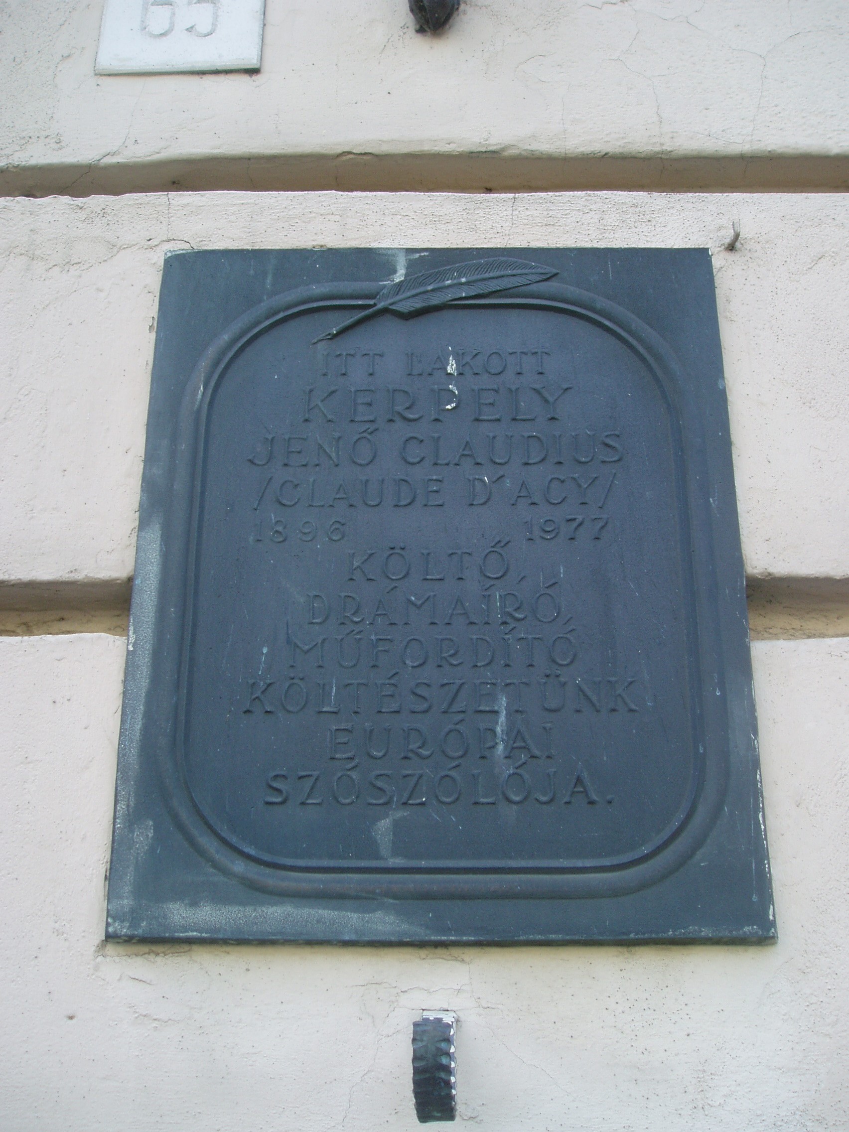 Nyilvános 1068 | 1437 | Sopron, Várkerület 65. | A kétemeletes városi palota homlokzatán olvasható emléktábla szerint itt lakott a soproni születésű Kerpely Jenő (1896-1977) költő, drámaíró, műfordító, újságíró. Budapesten, Bécsben és New Yorkban jogi tanulmányokat végzett. Ügyvédként és irodalmi jogképviseleti iroda vezetőjeként dolgozott Budapesten. Verseket, színműveket írt, német versfordításokat közölt osztrák, svájci és német lapokban. A Pester Lloydban külpolitikai cikkei jelentek meg. Thomas Mann ösztönzésére távozott a negyvenes évek végén Bécsbe. Ott folytatta műfordítói tevékenységét, számos magyar irodalmi művet fordított le németre, magyar költői antológiát adott ki. Német nyelvű műveit Eugen K. Claudius néven jelentette meg. A Claude d'Acy írói nevet is használta. Mindvégig az osztrák fővárosban élt, a végén eléggé visszavonultan. Magyar és német nyelven több könyve jelent meg a harmincas és negyvenes években. Felh. irod.: Borbándi Gyula: Nyugati magyar irodalmi lexikon és bibliográfia. Bp. Hitel, 1992 |