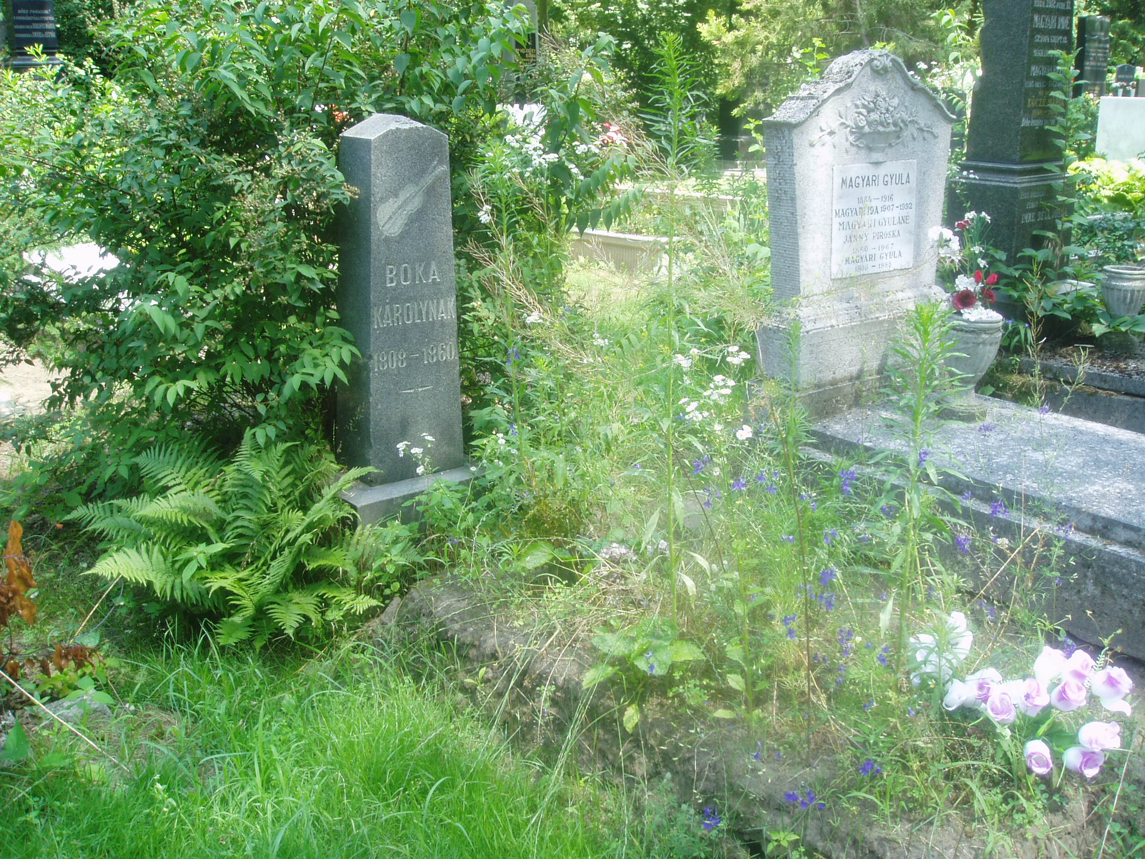 Nyilvános 1663 | 5208 | Debrecen, Bocskai út: Köztemető. Boka Károly sírja | Debrecen új köztemetőjét 1932-36 között alakították ki. A temetőkertet és a nagy művészettörténeti értéket képviselő ravatalozó épületét Borsos József tervezte. Itt nyugszik Boka Károly (1808–1860), Debrecen híres prímása, az „alföldi cigánykirály”. Hamvait 1945 után, a régi temető felszámolásakor szállították ide. Boka régi debreceni cigánydinasztia sarja volt, zenei tehetsége nagyon korán kibontakozott. Alig töltötte be tizenhatodik évét, amikor a városban húsz–huszonnégy tagú zenekarával nem mindennapi népszerűségre tett szert, s a debreceni országos vásárokra sereglő emberek más vidékekre is elvitték nevét. Az Aranybikában muzsikáló zenész ezreket keresett vonójával, szőlője volt a város határában és értékes háza a Várad utcában. A városi tanács 1846-ban felvette a város polgárainak sorába, ami óriási elismerésnek számított a büszke városban. Talán az egyetlen cigány volt, akit az urak nem tegeztek. Ő volt az, aki 1849 nyarán, a vesztes debreceni csata után az orosz vezérkar bevonulásakor Paskievics parancsára, miszerint a város lakossága zeneszóval ünnepelje meg az eseményt, a „Megvirrad még valaha, nem lesz mindig éjszaka” című dalt kezdte játszani… Temetésekor koporsóját díszruhás hajdúk kísérték, akiket a városlakók ezrei követtek hosszú sorban. Debrecen összes zenekara az ő szerzeményeiből játszott, a szertartáson a Kollégiumi Kántus énekelt. Boka számos ma is népszerű dal szerzője volt (Káka tövén költ a ruca, Édesanyám is volt nékem, Feketeszárú cseresznye, Debrecenbe kéne menni). A fénykép 2006 júniusában készült. Felh. irod.: Kovács Gergelyné: Debrecen. Bp. Panoráma, 1981 Nyakas László: Boka Károly, az alföldi cigánykirály. = Honismeret 1987. 2. |