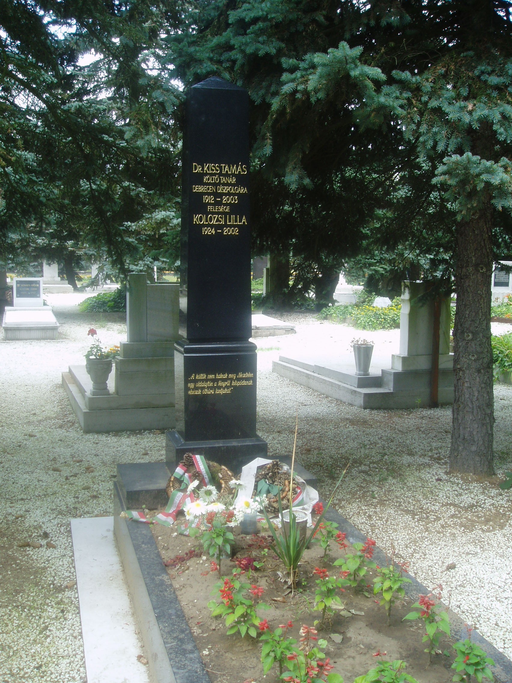 Nyilvános 1649 | 3797 | Debrecen, Bocskai út: Köztemető: Kiss Tamás költő sírja | Kiss Tamás (1912-2003) élete négy helyszínhez kötődik. Kisújszálláson született, s élt 18 éves koráig. Debrecenben végezte teológiai tanulmányait, majd segédlelkész bihari falvakban (rövid ideig Kisújszálláson), vallástanár Nagyváradon. Végül ismét Debrecen következett, ahol több mint félévszázadig tevékenykedett, s a város irodalmi és kulturális életének meghatározó alakjává vált. 1947-től a Dóczi Tanítónőképzőben tanított. 1953-tól a Kossuth Gyakorló Gimnázium vezető tanára. A debreceni kollégiumhoz való szoros kötődéséről tanúskodnak "Árkádiában éltünk" címen megjelent esszéi, Csokonai-regénye és a Kollégium múltját népszerűsítő könyvecskéje, "A bagolyvár és lakói". 1983-ban a volt diákok a frissen megalakult debreceni Kollégium Baráti Köre elnökének választották. Mint egy nekrológja fogalmazott: "Ahogy létezik századunkban pannon táj- és élményköltészet, Kiss Tamás azon kevesek egyike volt, akik az alföldi létforma, Debrecen ősi szellemisége meditatív ihletétől fölgazdagodva, intellektuális színezetű életműben barangolták be e különös minőségű kultúrhistória belső lírai tájait." A fénykép 2006 júniusában készült. Felh. irod.: http://kincsestar.radio.hu/panoptikum www.drk.hu/refivil/Dijak.htm www.vagy.hu/cikk.php?id=628 |