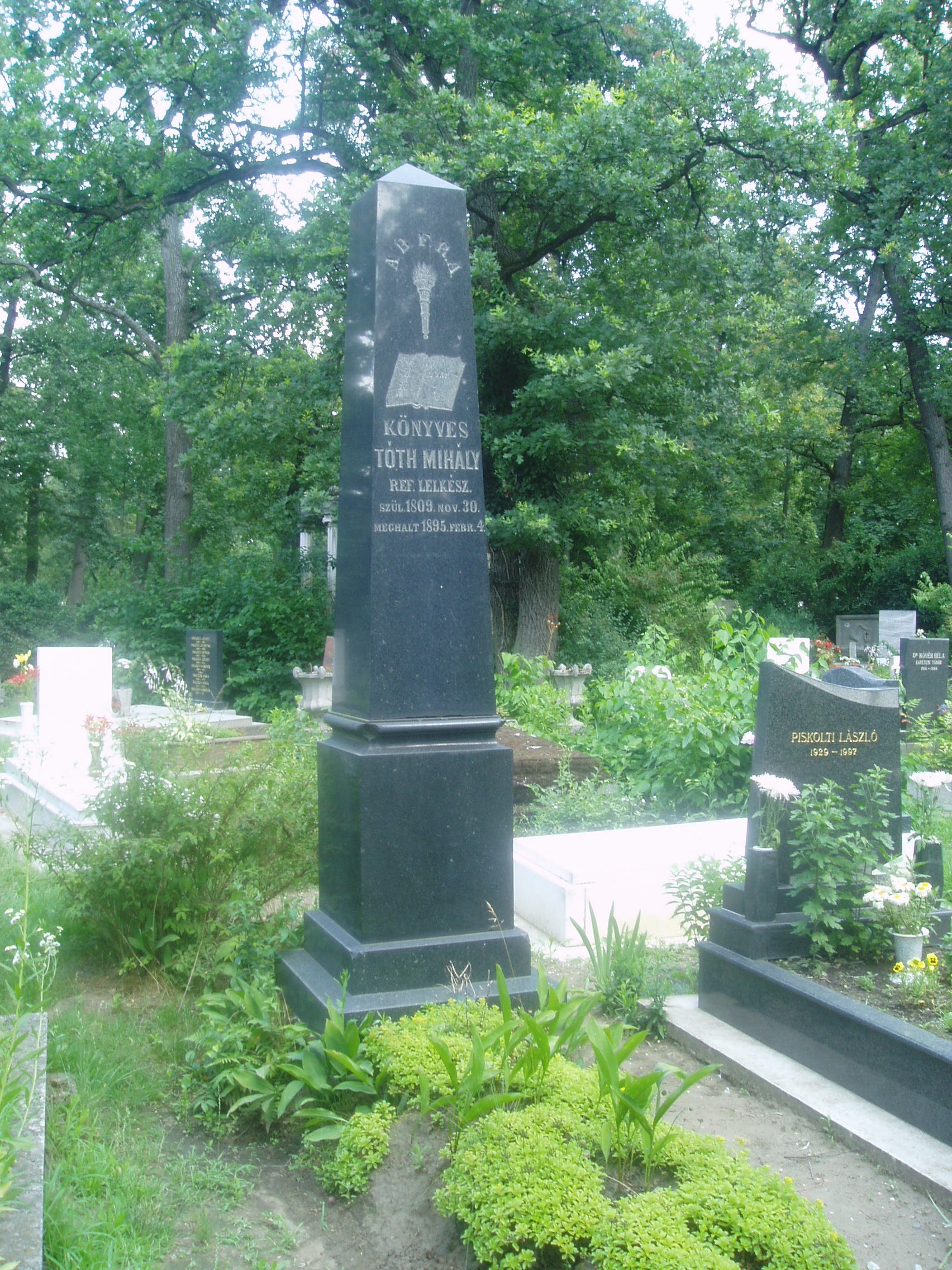 Nyilvános 1597 | 3960 | Debrecen, Bocskai út, Köztemető: Könyves Tóth Mihály sírja | Debrecen új köztemetőjét 1932-36 között alakították ki. A temetőkertet és a nagy művészettörténeti értéket képviselő ravatalozó épületét Borsos József tervezte. A díszsírhelyek a főbejárattól jobbra helyezkednek el. Itt nyugszik a magyar művelődástörténet számos nagy alakja, akiknek földi maradványait áthozták a többnyire felszámolt régi temetőkből. Itt nyugszik Könyves Tóth Mihály (Debrecen, 1809. nov. 30. – Debrecen, 1895. febr. 4.) református lelkész. 1836-tól debreceni prédikátor. A szabadságharc idején buzdító beszédeket mondott, sőt az aradi táborban is jelen volt. Ezért előbb halálra, majd húsz év várfogságra ítélték. 1856-ban kiszabadult, de hosszú ideig tilos volt lelkészi és tanítói állást elfoglalnia. 1863-tól Karcagon, 1871-től Debrecenben papként működött. Jó szónok volt, több prédikációja és halotti beszéde nyomtatásban is megjelent. (Lásd még: Debrecen, Széchenyi u. 4.) A fénykép 2006 júniusában készült. Felh. irod.: Kovács Gergelyné: Debrecen. Bp. Panoráma, 1981 Magyar életrajzi lexikon |