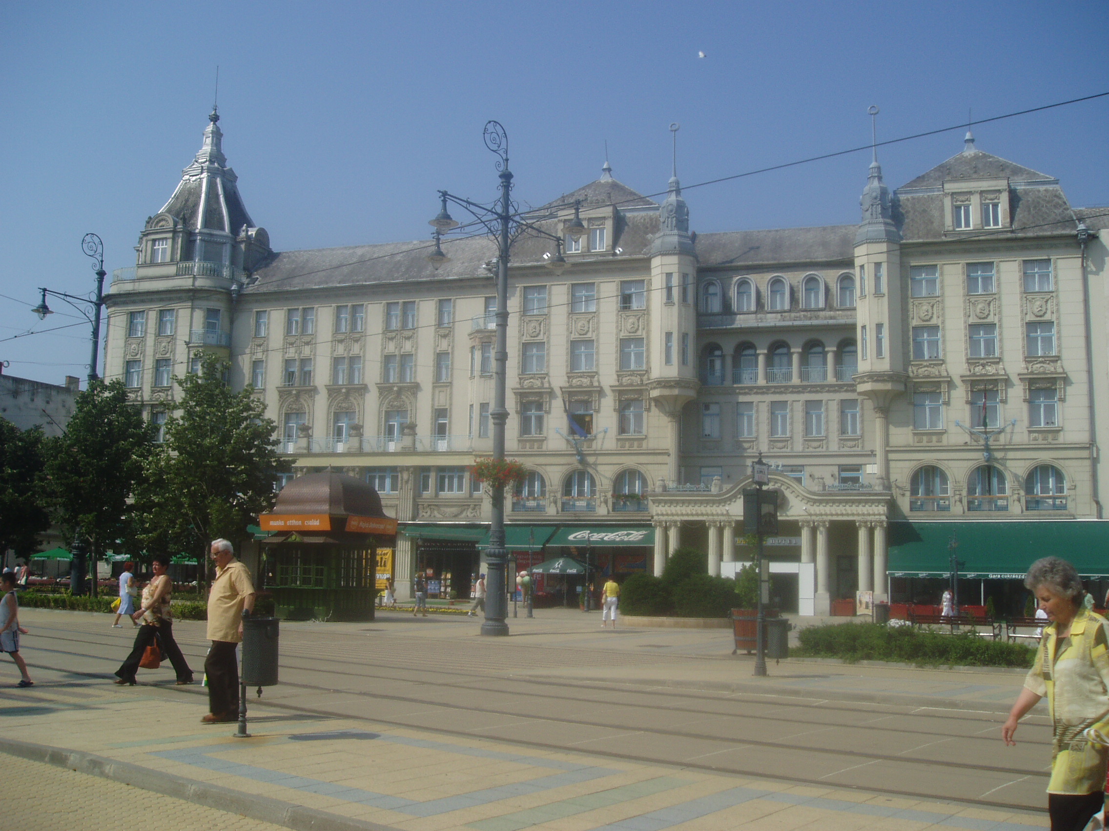 Nyilvános 1247 | 1909 | Debrecen, Piac utca 11-15. Arany Bika Szálloda | A szecessziós épületegyüttes 1913–1915 között épült Hajós Alfréd és Villányi Lajos tervei szerint. Új szárnyát 1976-ban építették hozzá. A négyemeletes főépület homlokzatán olasz kőfaragók által készített szecessziós plasztikák láthatók. A szálloda előterének két oldalát Józsa János színes üvegablakai díszítik. A régi és új szárnyat összekötő hallban egy rokokó pár életnagyságú szobra mellett vezet fel a lépcsősor az egykori díszteremhez. A ma Bartók Béláról elnevezett terem Debrecen 1500 férőhelyes, legnagyobb előadóterme. A tükörteremben Benyovszky István és Veres Géza festményei régi debreceni és hortobágyi életképeket idéznek fel. A mai Aranybika szálló helyén már a XVI. század végén vendégfogadó állt. 1699-ben árverezték el Bika András debreceni polgár egykor itt állott családi házát (a szálloda róla kapta a nevét), s benne négy vendégszobát rendeztek be. A hamarosan szűknek bizonyult, s a Rákóczi–szabadságharc idején erősen meg is rongálódott régi épületre 1799-ben emeletet húztak, majd 1809-ben ismét átépítették. Ekkor készült el vasból vert, bikát ábrázoló cégére, amely 1878-ig hirdette a közönségnek a szálló létét. 1840 körül a földszinten kávéházat nyitotak. 1848-ban egy időre Nádor szállóra keresztelték, s felsőbb parancsra a Bach–korszakban is így hívták. Az öreg épületben számos nevezetes vendég lakott, többek között Széchenyi István, Vörösmarty Mihály, Wesselényi Miklós, Deák Ferenc, Petőfi, Bem tábornok. Nagy Sándor és vezérkara 1849. augusztus 2-án innét indult a csatatérre, ahol a maroknyi magyar sereg nem tudott ellenállni a többszörös túlerőnek. Így estére már Paszkievics herceg és vezérkara ütütt a Bikában tábort s ünnepelték a diadalt, míg Debrecen lakói bezárt házakban, lefüggönyzött ablakok mögött siratták az elveszett reményeket. A XIX. század végére már nemzetközi viszonylatban is jól ismert, patinás szálló kicsinek bizonyult, ezért Steindl Imre tervei szerint pompás új épületet emeltek. A szállodával egyidejűleg kávéháza is megnyílt, első vendége Jókai Mór volt. Az új, egyemeletes szállodaépület pezsgő központja lett Debrecen szellemi és társasági életének. A debreceni írók és művészek, valamint a fővárosból idelátogató barátaik gyakran találkoztak a „közvélemény–asztalnak” nevezett irodalmi törzsasztalnál. 1913-ban elkezdték ennek az épületnek a lebontását is, s a szálló mostani épülete 1915-re lett készen. Az 1920-as években gyakori vendége volt a Bikának Móricz Zsigmond (szobáját születésének évfordulóján emléktáblával jelölték meg) és tizenöt éven át lakott benne Oláh Gábor költő. 1944/45 telén a szálloda adott otthont az Ideiglenes Nemzetgyűlés, majd az Ideiglenes Kormány tagjainak. Felh. irod.: Papp Antal: Debrecen. Bp. Panoráma, 1976 Kovács Gergelyné: Debrecen. Bp. Panoráma, 1981 300 év históriája: egy polgárváros az Aranybikában. Debrecen, Pro Millennium, 1999 |