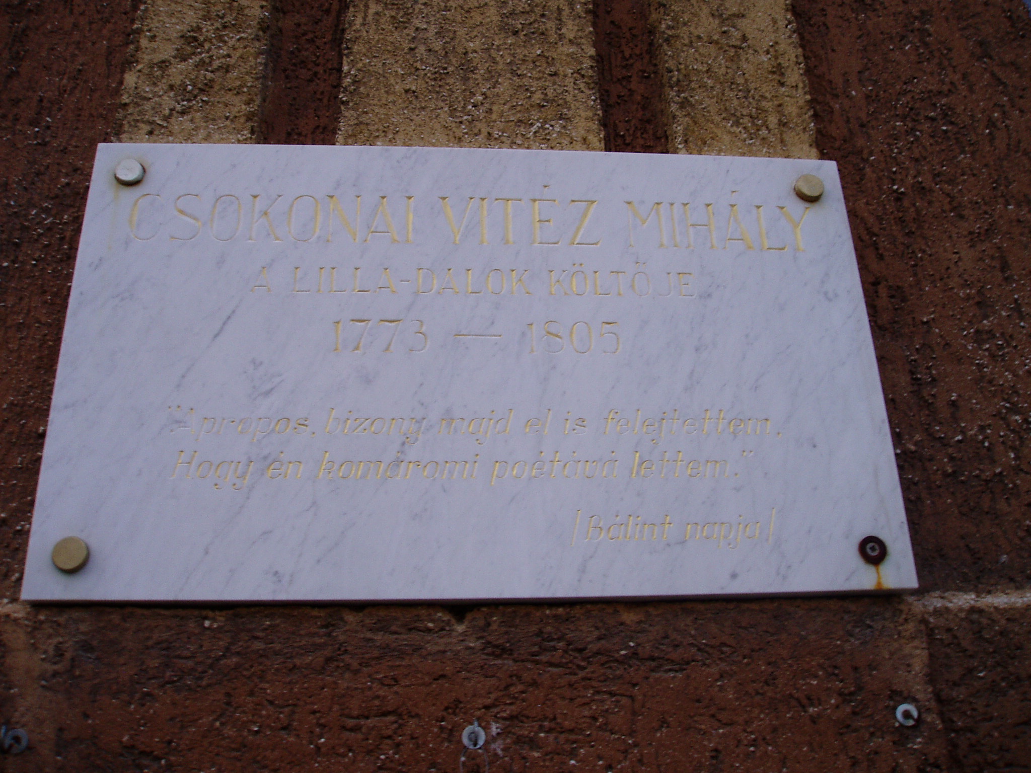 Nyilvános 1622 | 3957 | Komárom (Komárno), Jókai u. Református Kollégium, Csokonai Vitéz Mihály emléktáblája | A református templommal szemben, tágas udvar közepén áll a volt Református Kollégium történelmi épülete. Az egyemeletes, hatalmas tetőzetű, kis bádogtornyú épület 1796. december 28-án készült el. A "múzsáknak állított" iskolaépület ünnepélyes megnyitására 1797. január 2-án került sor. A komáromi kollégium - tudós tanárai révén - rövidesen olyan hírnévre tett szert, hogy nem csupán a Komárom megyei fiatalok tanultak itt, hanem számosan a szomszédos és távolabbi megyékből is. Itt kezdett iskolába járni 1831 őszén a kis Jókai Mór is. A kollégium másik irodalomtörténeti nevezetessége, hogy itt az udvaron látta meg először Csokonai Vitéz Mihály Vajda Juliannát 1797. április 26-án. Csokonai 1797 február közepén utazott Komáromba a megye első szolgabírója, Laky Bálint kérésére, aki biztatta, hogy ott a költő próbálja meg újraéleszteni a Mindenes Gyűjtemény c. folyóiratot. Akkoriban történt, hogy a Napóleon elleni háborúhoz hadba szállt a magyar nemesség is. A Komáromban gyülekezőkhöz Csokonai lelkesítő ódát írt "A nemes magyarságnak felülésére" címmel. Ezt a verset 1797. április 26-án, a Református Kollégium udvarán a város legszebb lánya, Vajda Julianna szavalta el. Ekkor személyesen még nem ismerkedtek meg, arra valamivel később, Bédi János és felesége, Fábián Julianna költőnő házánál került sor. Csokonai így írt "A fogadástétel" c. versében: Egy nyári este Lillát, A gyenge rózsaszájú, A tűzszemű leánykát Megláttam, és azonnal Látnom, szeretnem - egy vólt. A fénykép 2005. júliusában készült. Felh. irod.: Mácza Mihály: Komárom nevezetességei. Pozsony, Madách-Posonium, 2002 Bertók László: Így élt Csokonai Vitéz Mihály. Bp. Móra Kiadó, 1977 Csokonai emlékek. Szerk. Vargha Balázs. Bp. MTA Irodalomtudományi Intézet, 1960 |