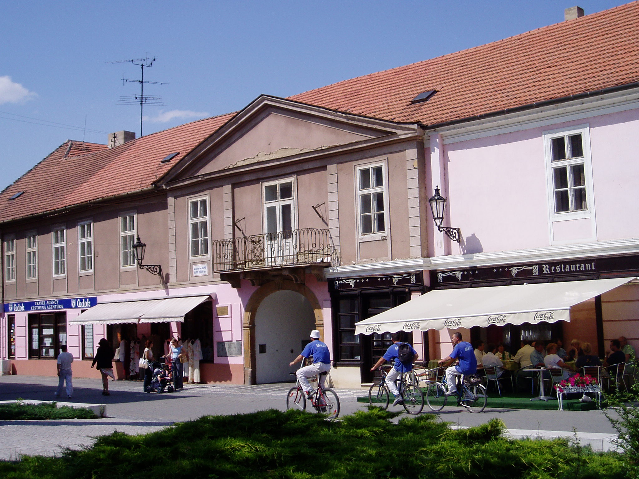 Nyilvános 1261 | 2339 | Komárom (Komárno). Klapka tér 9. Zichy-palota | A Klapka tér legnagyobb épülete a volt Zichy–palota. Zichy Miklós gróf, szabolcsi főispán építtette a XVII. század második felében. Eredetileg barokk stílusú volt, de miután a 1763-as nagy komáromi földrengés romba döntötte, klasszicista stílusban épült újjá, két épületszárnnyal bővülve. Udvarának végén az 1800-as évek elejétől 1827-ig emeletes épület állt, ennek emeleti részén tartották a táncmulatságokat és a színházi előadásokat. Az első hivatásos magyar színtársulat Komáromban Benke József és Kemény János vezetésével lépett fel 1811 májusában (ők a második pesti színtársulatból váltak ki). A társulatban ott volt Balogh István, Déry István, Láng Ádám, Murányi Zsigmond, Murányiné Lefèvre Teréz és a pályája legelején levő, tizennyolc éves Scheckenbach (Schenbach) Róza, aki később Déryné Széppataki Róza néven vált a magyar játékszín történetének állócsillagává. Legközelebb Balogh István székesfehérvári társulata jutott el Komáromba, valamikor 1813 és 1815 között. Szinnyei József szerint ennek a társulatnak Katona József is tagja volt, s Idegen művésznéven fellépett itt a Hamlet címszerepében és saját, Luca széke című darabjában. 1819 októberében Kilényi Dávid kecskeméti társulata érkezett a városba. Előadásaikról Ásvay Jókay József, Jókai Mór édesapja tudósított a helyi sajtóban. A közelmúltban a Zichy–palota udvarán építették ki az ún. Európa udvart. A helyi viszonylatban gigantikus méretű vállalkozás célja, hogy élőben mutassa be harmincöt európai ország építészetét. A városrész egyben Komárom új szolgáltató központja is, üzletekkel, éttermekkel, kávézókkal, valamint egy föld alatti bevásárlóközponttal. A palota első emeletén (bejárat a képen látható kapun a Szentháromság-szobor mellett) a város két híres szülötte, Jókai Mór és Lehár Ferenc emlékkiállítása látható. Különösen a Jókai-kiállítás gazdag eredeti relikviákban. A fénykép 2005. júliusában készült. Felh.irod.: www.komarno.sk Mácza Mihály: Komárom nevezetességei. Pozsony, Madách-Posonium, 2002 Szénássy Zoltán: Rév–Komárom. KT Kiadó, 1998 Tóth László: "...miként hajdan az apostolok" : a komáromi magyar színjátszás története. Dunaszerdahely, Lilium Aurum, 1997 |