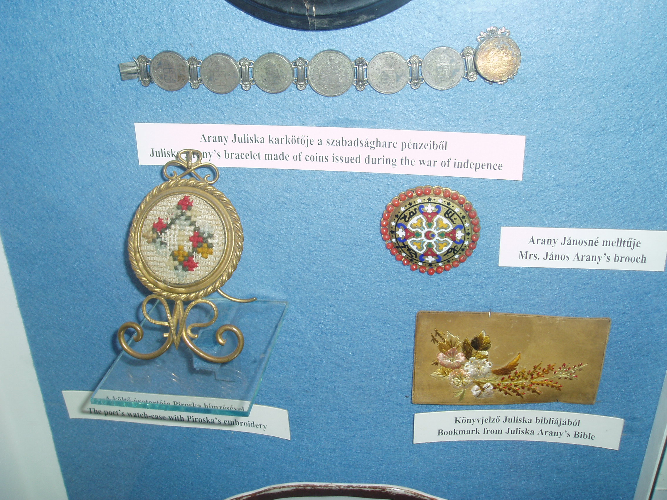 Nyilvános 1692 | 3427 | Nagykőrös, Ceglédi út 19. Arany János Múzeum | Arany János 1851 és 1860 között élt Nagykőrösön, magyart tanított a helyi gimnáziumban. A városban fennmaradt s Arany halála után a családja által adományozott relikviákból 1910-ben Arany-emlékszobát rendeztek be Arany egykori működésének helyén, a gimnáziumban. Később e relikviák az 1928-ban alapított városi, Arany János Múzeumba kerültek. A képen látható, 48-as pénzérmékből készült karkötőt a költő leánya, Juliska Nagykőrösön is viselte. A fénykép 2006 augusztusában készült. Felh. irod.: www.c3.hu/~pmiajm/hunnagyk.htm www.vendegvaro.hu Novák László: Arany János Múzeum. Nagykőrös, 2000 Törös László: A nagykőrösi Arany emlékek katalógusa. = A nagykőrösi művelődés hármas kis tüköre. Nagykőrös, 1935 |