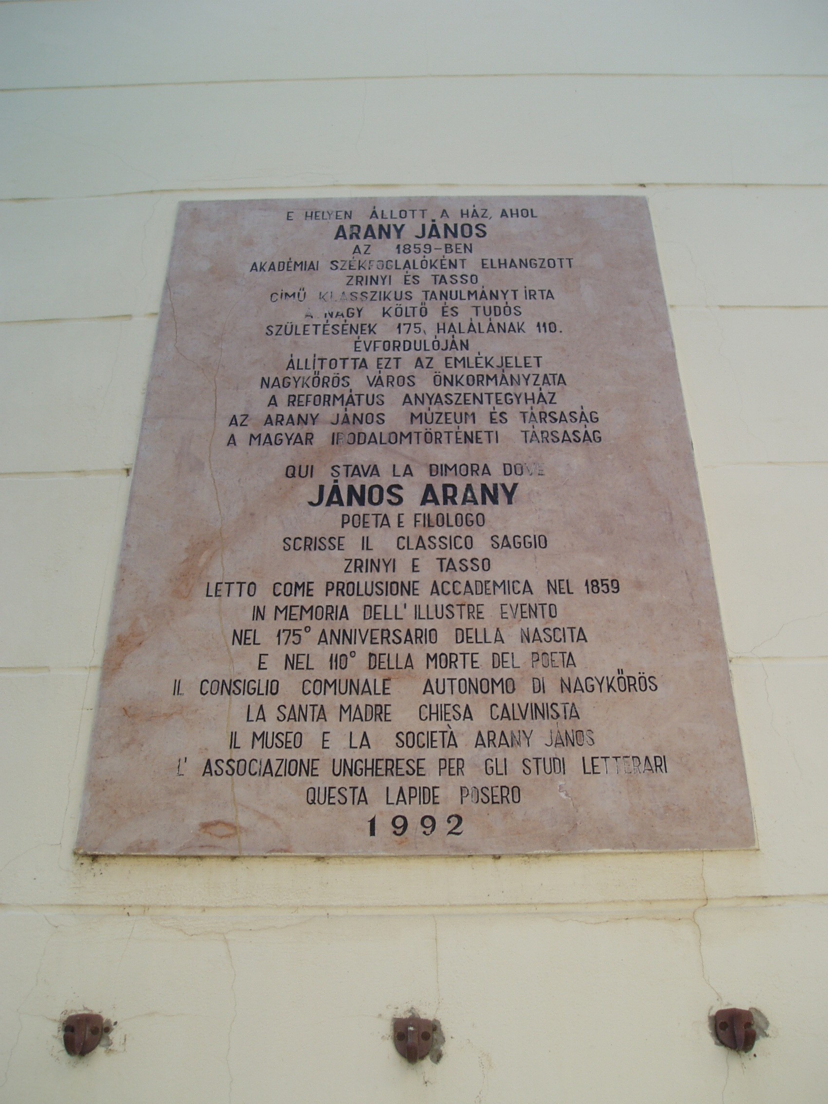 Nyilvános 1675 | 3543 | Rövid leírás | Teljes leírás (748 B) | Nagykőrös, Hősök tere 4. Itt, ahol ma a tanítóképző intézet sarka áll, korábban egyházi épület volt. Abban lakott Arany János nagykőrösi tanársága utolsó idejében, 1856 és 1860 között. Az épület Hősök tere felőli oldalán már 1901-ben emléktáblát állítottak. A képen látható kétnyelvű (magyar-olasz) emléktáblát 1992-ben avatták fel annak emlékére, hogy Arany itt írta akadémiai székfoglalóját, "Zrínyi és Tasso" című tanulmányát. A fénykép 2006 augusztusában készült. Felh. irod.: Törös László: A nagykőrösi Arany emlékek katalógusa. = A nagykőrösi művelődés hármas kis tüköre. Nagykőrös, 1935 |