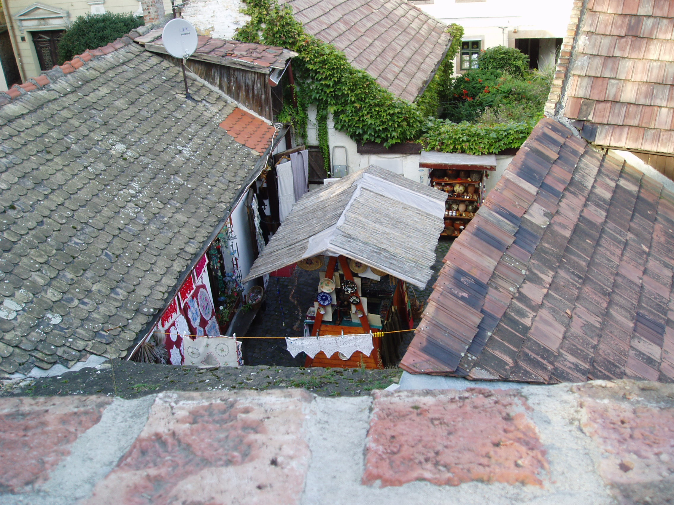 Nyilvános 1204 | 1910 | Szentendre, Várdomb | Szentendre egyik legszebb része a Várdomb, a település középkori központja. Tömör mellvéddel körülvett sétányáról megragadó látvány nyílik az oly sokszor megfestett szentendrei háztetőkre, a kis belső udvarokra, a belvárosra, a Dunára és a túloldali szigetre. A fénykép 2005 szeptemberében készült. Felh. irod.: Szentendre. Szerk. Sándyné Wolf Katalin. Bp. Panoráma, 1985 www.vendegvaro.hu www.szentendre.hu |