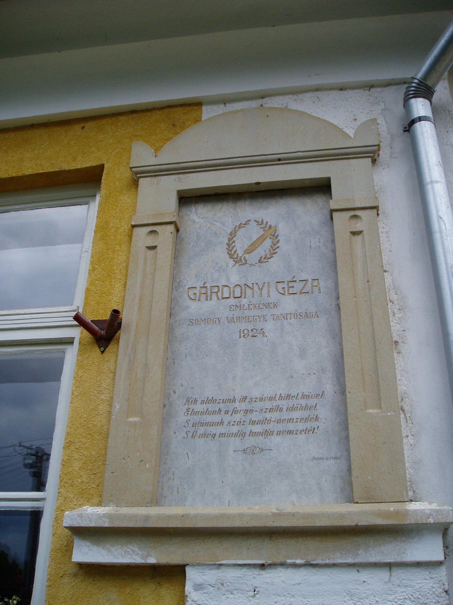 Nyilvános 1228 | 2067 | Karád, Gárdonyi Géza utca 2. | A klasszicista formáját ma is őrző földszintes iskolaépület falán két emléktábla is olvasható. A korábbi, 1924-ben avatott tábla Gárdonyi Géza írónak állít emléket, aki — még mint Ziegler Géza — itt kezdte tanítói pályafutását 1882-ben. Később írásaiban kissé keserűen, csalódottan örökítette meg ezt az időszakot. Az én falum című novelláskötete a karádi, nem éppen felhőtlenül boldog éveket, anyagi nyomorúságát idézi, ugyanakkor felejthetetlen képet rajzolt benne a környezetről és a falusi emberekről. A másik emléktábla Kodály Zoltánt idézi, aki 1933 és 1938 között több alkalommal is járt a községben. Ide, az iskola épületébe hívta össze Happ József tanító az énekelni szerető falusiakat, s Kodály népdalokat gyűjtött tőlük. Happ József hamarosan Budapesti lakásán kereste fel Kodályt, s felkérte, hogy a gyűjtött dalokból állítson össze egy csokrot a falu fennállásának 1934-ben ünnepelt 800. évfordulójára. Így született meg Kodály nevezetes férfikari műve, a Karádi nóták – Karád 800 éves évfordulójának ünnepére, amellyel halhatatlanná tette a kis falu nevét. A fénykép 2005 júliusában készült. Felh. irod.: Látnivalók Somogy megyében. Miskolc, Well-PRess, 2000 /Vendégváró/ Herke Mihály: „Kocsmárosné gyöngyviolám” – Kodály és Karád. = Somogy 1982. 6. |