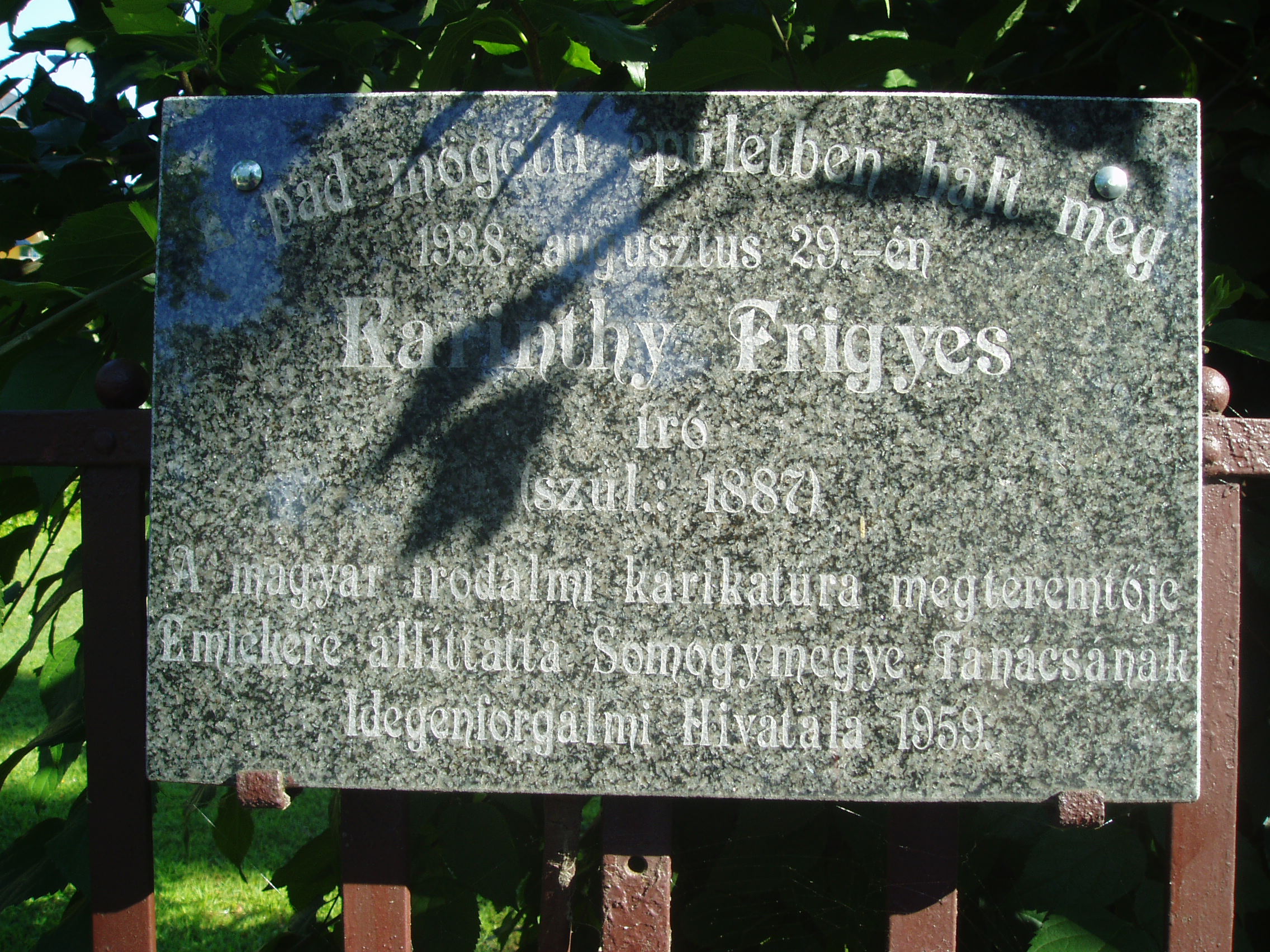 Nyilvános 1268 | 2253 | Siófok, Batthyány utca 46. | Siófok egyik legendás épülete és intézménye a volt Vitéz Panzió. Az épületet az akkori idők egyik legtehetségesebb művésze, a kiskorpádi születésu Kozma Lajos (1884-1948) Kossuth-díjas építész tervezte. Az évtizedek során számos nevezetes vendége volt. Az épület előtt támaszkodik a kerítésnek Karinthy Frigyes emlékpadja. Ebben a házban hunyt el 1938. augusztus 29-én a XX. század legegyetemesebb érdeklődésű és egyik legtermékenyebb magyar írója. Karinthy Frigyes - családjával együtt - évtizedeken keresztül volt a Vitéz Panzió viszatérő vendége. Az író imádta Siófok nyári hangulatát, vendéglőit, a kaszinók éjszakai mondén életét s a délutáni kártyacsatákat. A Stockholmban 1936-ban elvégzett agyműtét után még felépült, de két év múlva itteni szobájában agyvérzést kapott és meghalt. Utolsó estéjén még meglátogatta a panzióban jóbarátja, Rejtő Jenő. Karinthy Frigyes fiai, a tragikus sorsú költő, Karinthy Gábor és Cini, azaz Karinthy Ferenc író is nagyon sokat tartózkodtak itt. Karinthy Ferenc az itteni életet, ifjúságának csínyjeit számos írásában rögzítette. Faludy György költő is lakott a Vitéz-panzióban. “Itt nyaraltunk 1914-től 1918-ig minden nyáron. Apám akkor katona volt. A Batthyány utca 7.-ben laktunk a szüleimmel, illetve apámmal, aki a frontról egyszer meg is látogatott bennünket. Aztán később is megfordultam Vitéz Miklósné panziójában, amikor Karinthy Frigyes is itt nyaralt" - mesélte később a költő. Felmerült az ötlet, hogy az épületben létrehozzák Karinthy Frigyes emlékmúzeumát, de a megvalósítás még messze van. Viszont 1998-ban a Rózsakertben (a Balaton-parton) felállították egészalakos szobrát, Varga Tamás alkotását. A fénykép 2006 júliusában készült. Felh. irod.: http://www.siofok.hu/seta_a_varosban_hu.php Matyikó Sebestyén József: Zsidók Siófokon. Debrecen, Ethnica, 2000 |