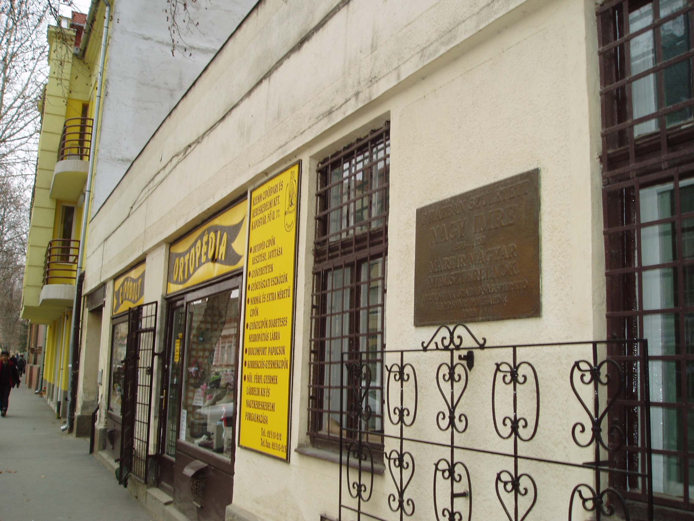Nyilvános 1264 | 2257 | Kaposvár, Fő utca 77. | Kaposvár hosszú főutcájának a városközponttól távolabbi részén ma is álló kis házban született Nagy Imre mártír miniszterelnök 1896. június 7-én. Emléktábláját 1989-ben, rehabilitálásának évében helyezték el. 1996-ban, a forradalom 40. évfordulójára szobrot is állítottak emlékére a Megyeháza előtt, az 56-os emlékmű mellett (Paulkovics István alkotása). Nagy Imre református szegényparaszti családból származott. Apja postai szerelőmunkás volt. Anyja, mielőtt férjhez ment volna, a somogyi alispánnál cselédlányként szolgált. Tanulmányait a 4 elemi (lásd: Kaposár, Fő u. 44.) és a 4 polgári osztályig végezte, mert 1912-ben saját elhatározásból elhagyta kaposvári gimnáziumot és géplakatos segédnek állt. A segédi oklevelet 1914-ben szerzete meg, majd a tanulmányait folytatandó beiratkozott a kaposvári felső kereskedelmi iskolába. Ezt már nem tudta elvégezni, mert 1915 májusában behívták katonának. A Monarchia katonájaként 1918-ban az orosz fronton fogságba esett. Politikai pályafutása ekkoriban kezdődött el. A fénykép 2006 márciusában készült. Felh. irod.: Látnivalók Somogy megyében. Miskolc, Well-PRess, 2000 hu.wikipedia.org/wiki/Nagy Imre |