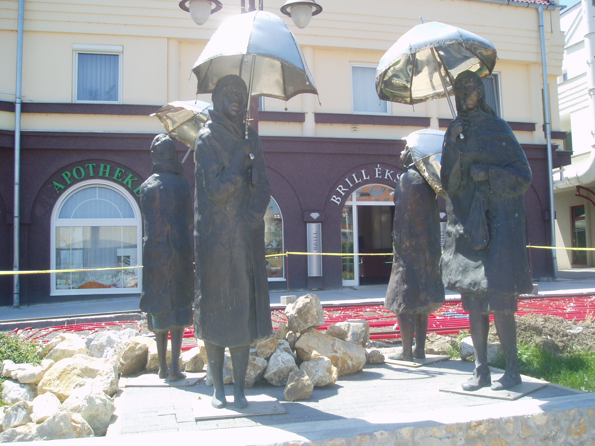 Nyilvános 1299 | 4158 | Siófok, Fő tér: Varga Imre: Várakozók | Varga Imre szobrászművész 1923. november 1-jén született Siófokon. Már gyermekkorában - a siófoki elemi iskolában - rendkívül jó rajzkészségével tűnt ki. 13 évesen szerepelt egy képével Párizsban. A képzőművészet terén elért kimagasló érdemeiért, amellyel Magyarország és Siófok város hírnevét is öregbítette, 1985-ben ő lett Siófok város első díszpolgára. Hazai és külföldi tereken, templomokban, középületekben mintegy 300 alkotását helyezték el. Szobrai állnak Belgiumban, Franciaországban, Lengyelországban, Németországban, Norvégiában és Izraelben. Siófokon a Fő téren szabadtéri szoborkiállítása látható. Az itt lévő Várakozók című szoborkompozíciójának - amelyet gyakran neveznek Esernyősök-nek is - eredetije Óbudán, kétalakos változata pedig Los Angelesben van. A fénykép 2006 júliusában készült. Felh. irod.: http://www.siofok.com/uj/object/varga-hu.html |