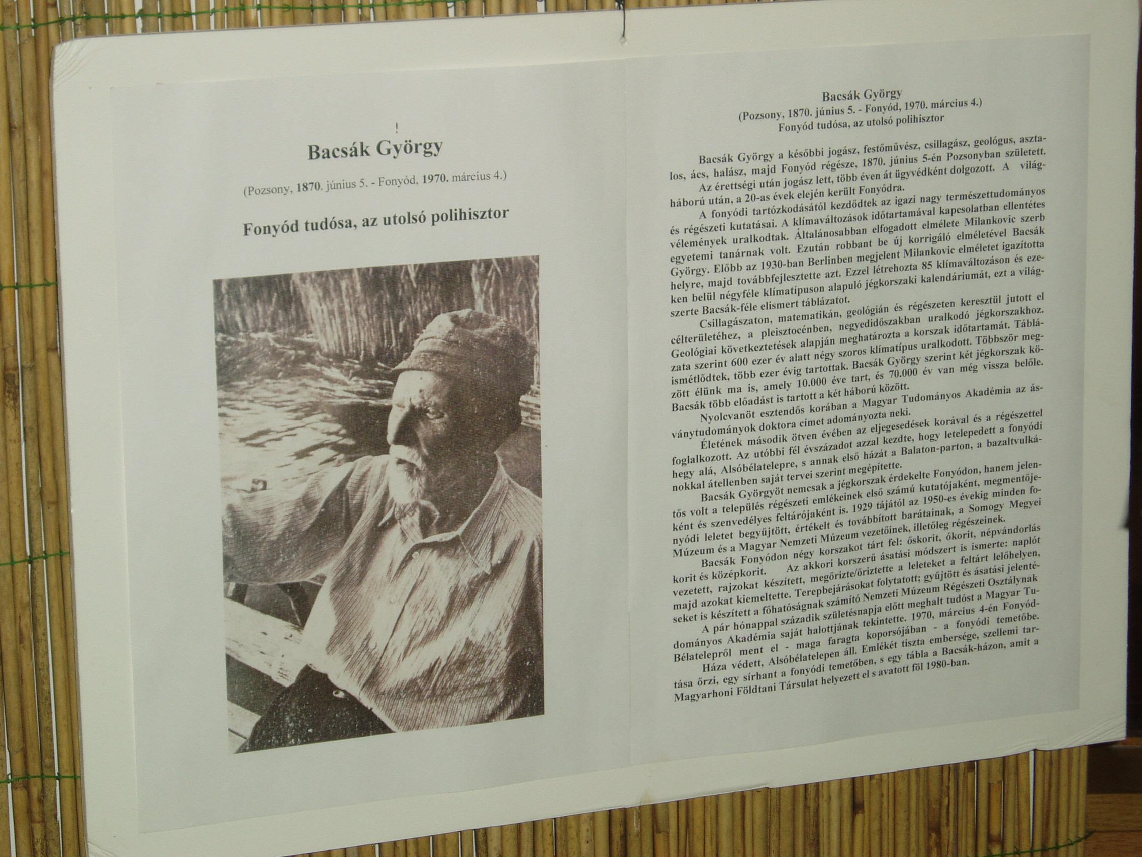 Nyilvános 1155 | 1922 | Fonyód, Bartók Béla utca 3. Természetvédelmi és Helytörténeti Múzeum - Bacsák György | A fonyódi Várhegyen kialakult Bélatelephez tartozó, a Balaton egyik legszebb panorámájú helyén álló villát az orvosi doktorátussal rendelkező, többek között Kelet-kutatóként is számon tartott lászlófalvi Velics Antal (1875-1915) építtette az 1900-as évek elején. Az épület az 1980-as évek végéig moziként üzemelt. Felújítása után, 2004-ben nyílt meg termeiben a fonyódi Természetvédelmi és Helytörténeti Múzeum. Benne a Fonyód történetét és néprajzát bemutató állandó kiállítás mellett időszaki kiállításokat is rendeznek. Az állandó kiállítás megemlékezik Bacsák Györgyről (1870-1970), Fonyód tudósáról is. Az utolsó polihisztor - jogász, festőművész, csillagász, geológus, asztalos, ács, halász, majd Fonyód régésze - 1870. június 5-én Pozsonyban született. Érettségi után a budapesti Pázmány Péter Tudományos Egyetem jogi karán szerzett jogászdoktori oklevelet, de elvégezte a festőakadémiát is kezdve Budapesten, majd befejezve Münchenben. Több éven át ügyvédként dolgozott és az elesettek, a kis és szegény emberek ügyeivel foglalkozott majd jogtanácsosként működött. Az első világháború után, az 1920-as évek elején került át a Csallóközből előbb a Fejér megyei Hörcsökre, majd Fonyódra. Házát (Báthory utca 5.) a fonyódi hegy alatt saját kezűleg építette. Ekkortól kezdődtek igazi nagy természettudományos és régészeti kutatásai. Létrehozta 85 klímaváltozáson és ezeken belül négyféle klímatípuson alapuló jégkorszaki kalendáriumát, ezt a világszerte elismert táblázatot. Mint a fonyódi könyvtár honlapján közzétett megemlékezésben olvasható, matuzsálemi korában is derűs lelkületű, magányában is a természet ölében élő bölcs ember maradt. Amilyen szálfaegyenes volt alakja, olyan egyenes volt a jelleme is. Egész lényéből áradt a derű, nyílt és közvetlen emberként ismerték. Mindenki által tisztelt, szókimondó ember volt. Szelleme, lelke, munkakedve, munkabírás friss, töretlen maradt egészen haláláig. A száz éves korában elhunyt legendás tudós maga faragta koporsójában nyugszik a fonyódi temetőben. Villája védett épület, rajta emléktáblájával. A fénykép 2007 júliusában készült. Felh. irod.: http://muzeum.fonyod.hu/ http://konyvtar.fonyod.hu/bacsak.htm |
