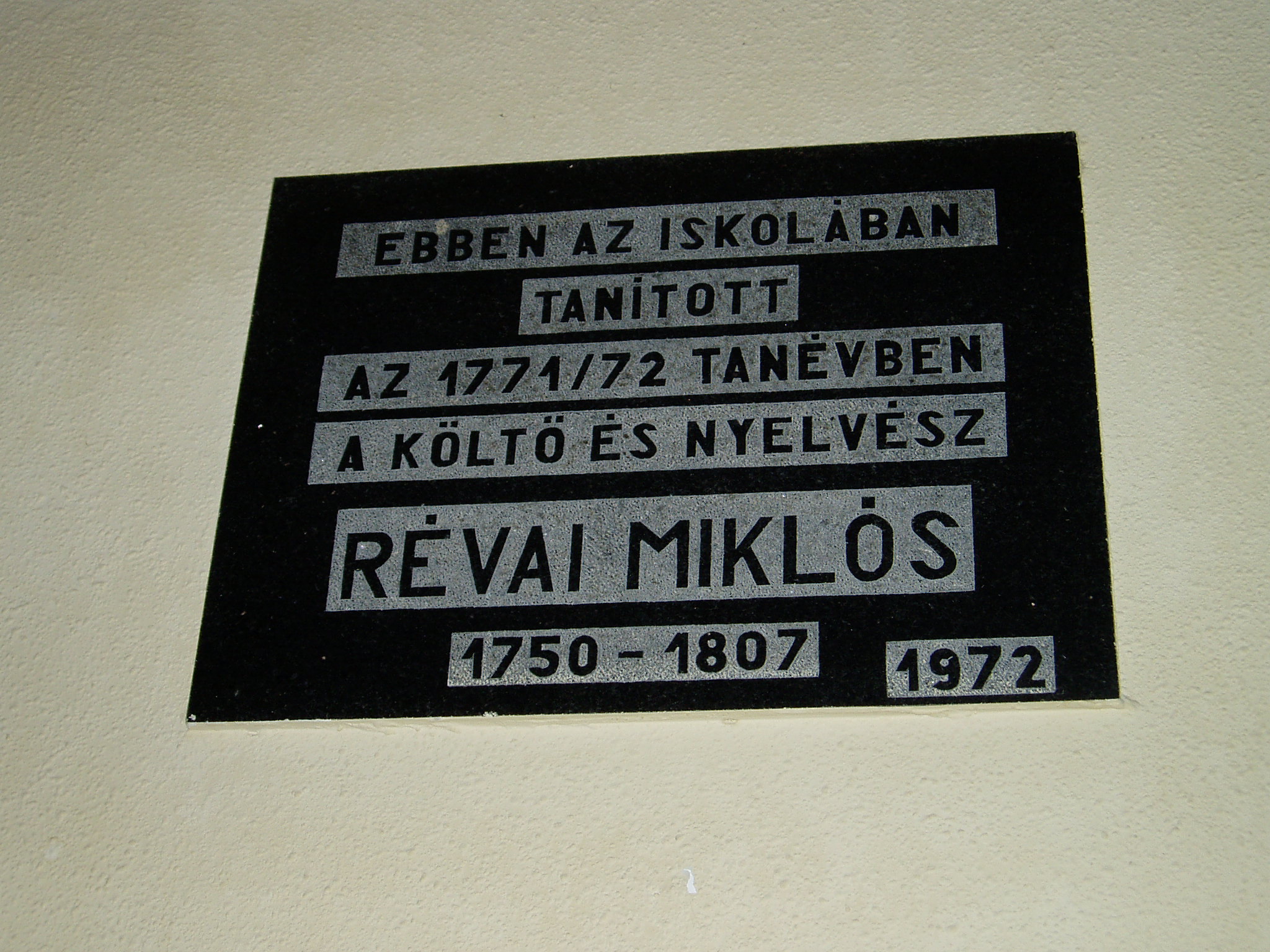 Nyilvános 1580 | 3190 | Tata, Tanoda tér 5. Eötvös József Gimnázium: Révai Miklós emléktáblája | A tatai gimnáziumot 1765-ben gróf Esterházy Miklós alapította, s vezetésére a piarista tanítórendet kérte fel. Az iskola kezdetben a közeli majki kamalduli szerzetesek többször is átalakított gazdasági épületeiben működött. A jelenlegi iskolaépületet a XX. század elején emelték, 1912-ben kezdődött meg benne a tanítás. Az első emeleti folyosó falán neves egykori tanárok és diákok emléktábláit helyezték el. Révai Miklós (1750-1807) költő és nyelvész 1771/72-ben volt a tatai gimnázium tanára. A magyar felvilágosodás kiemelkedő képviselője volt. Méltán nevezhetjük kora polihisztorának - irodalmár, nyelvész kiváló tanáregyéniség volt. Részt vett az irodalmi és tudományos közéletben, a Magyar Tudós Társaság létrehozásában, értett a rajzhoz és az építészethez. Maga is írt és fordított verseket; Rájnis Józseffel és Baróti Szabó Dáviddal a klasszikus triász tagjaként a magyar időmértékes verselés egyik meghonosítója. Életművének jelentőségét hegedűs Géza így summázta: "Egész szépirodalmi munkássága csak szellemi kirándulás volt a valószínűtlenül sokoldalú tudósnak és tanítónak és újságírónak és építészetért, rajzért lelkesedő művészeti szakembernek, aki mindenekelőtt nyelvész: a magyar nyelvtudomány legfőbb klasszikusa, az összehasonlító nyelvészet nemzetközi előfutárainak egyike, a magyar tudománytörténet egyik múlhatatlan büszkesége." A fénykép 2005. júliusában készült. Felh. irod.: www.eotvos-tata.sulinet.hu Wehner Tibor: Tatai szobrok, emlékművek, emléktáblák. Tata, 1980 Hegedűs Géza: A magyar irodalom arcképcsarnoka. Bp. Móra Kiadó, 1976 |
