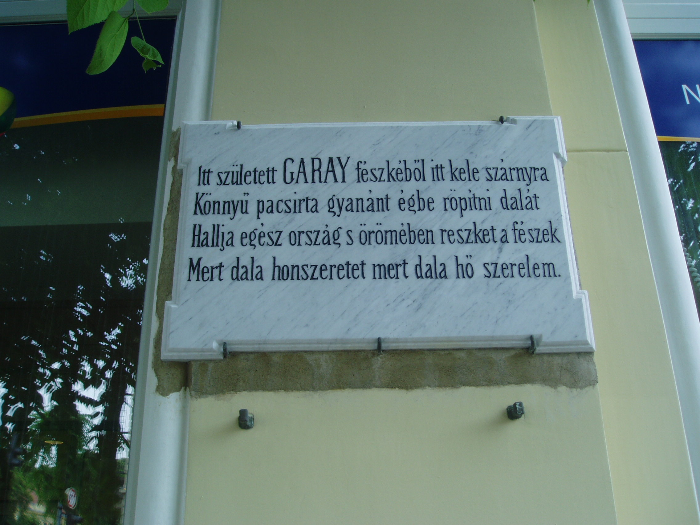 Nyilvános 1186 | 1752 | Szekszárd, Széchenyi utca 40. Diczenty-ház | A mostani városi bérpalota, a XIX. század végén eklektikus stílusban épült ún. Diczenty-ház helyén állott az a földszintes sarokház, amelyben Garay János költő született. 1881-ben még az eredeti házon helyezték el a költő emléktábláját, amelyet aztán áttettek a helyére épült Diczenty-házra. Ma viszont az eredeti táblának már csak egy másolata látható, csak Szász Károly verssorai ugyanazok... Az 1812. október 12-én született Garay János apja kereskedő, árvaszéki teendőkkel megbízott, köztiszteletben álló szekszárdi polgár volt. Anyja, Valter Ilona tizenkét gyermeknek adott életet. A szekszárdi gyermekkor meghatározóvá vált a költő számára. Házukban otthonos volt az új magyar irodalom, és Garayban hamarosan mutatkozott a költői hajlam. Legismertebb műve, Háry Jánosról szóló elbeszélő költeménye is szekszárdi élményből született. A fénykép 2006 júliusában készült. Felh. irod.: www.csatolna.hu/hu/korbejart/garay.shtml Hegedűs Géza: A magyar irodalom arcképcsarnoka. Bp. Trezor, 1993 |