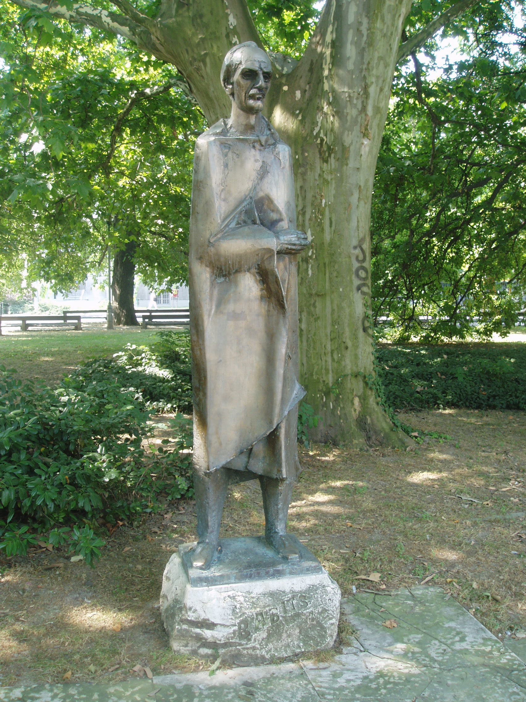 Nyilvános 1152 | 1887 | Szekszárd, Sétakert: Babits Mihály szobra | A szekszárdi születésű (lásd: Szekszárd, Babits M. u. 13.) Babits Mihály egészalakos szobrának alkotója Kis Kovács Gyula szobrászművész. A bronzszobrot 1971-ben állították fel a Babits nevét viselő művelődési ház melletti kis téren. Onnan helyezték át a mai helyére, a Sétakert platánjai alá. A fénykép 2006 júliusában készült. Felh. irod.: www.szekszard.hu |