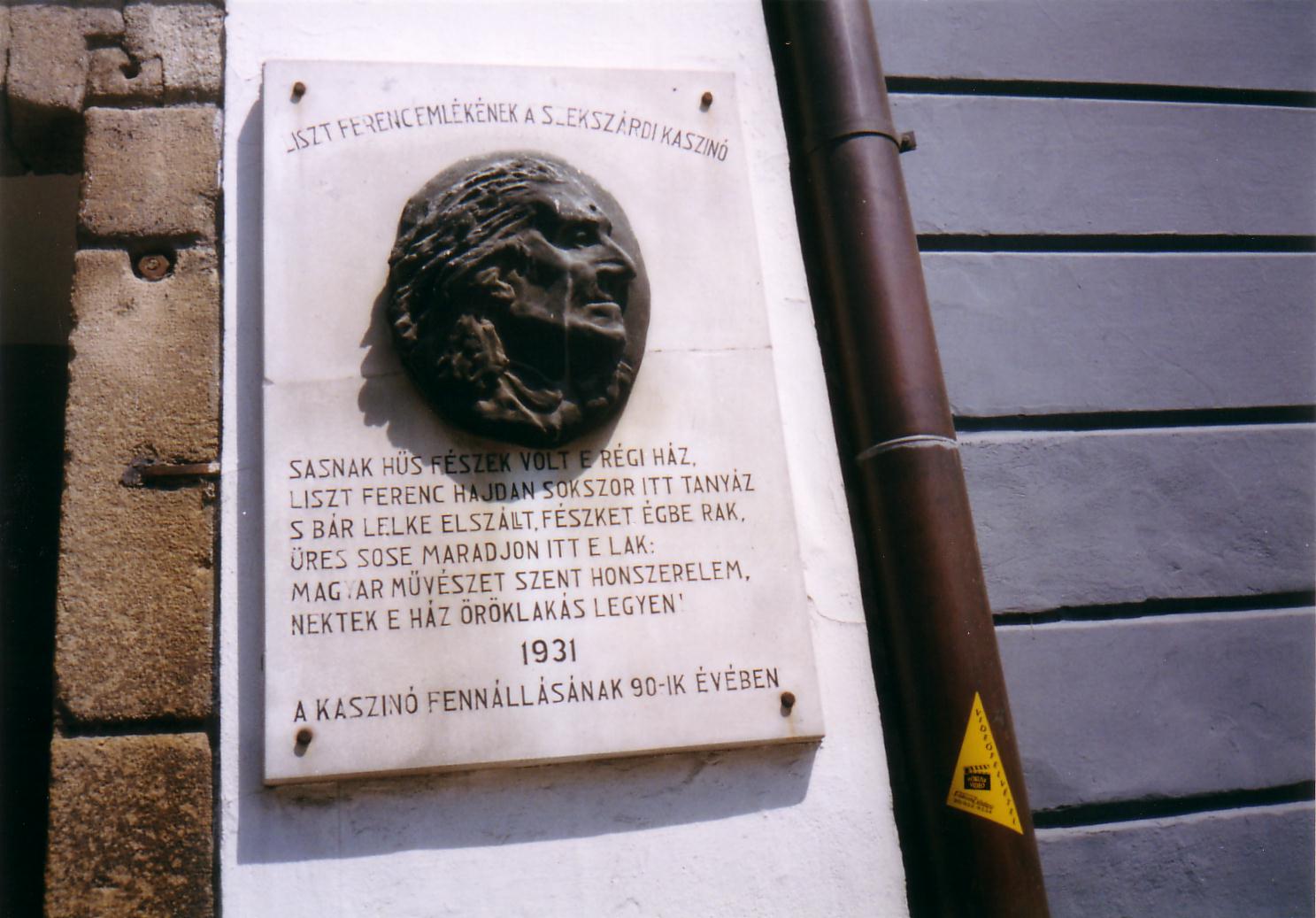 Nyilvános 1148 | 1806 | Szekszárd, Széchenyi utca 36-38. Augusz-ház | Az Augusz–család egykori kúriája, amelyben négy alkalommal vendégeskedett Liszt Ferenc, három eltérő korú épületrészből áll. Legrégebbi része a jelenleg kékesszürkére festett déli szárny. Id. Augusz Antal 1820 körül építtette, az ő fia volt Liszt barátja, a később bárói címet kapott Augusz Antal. Az épület három homokkő oszlopon nyugvó középső része az 1830-as évekből való. A trieszti Miramare–kastély által ihletett rózsaszínű, tornyos északi szárnnyal pedig az 1860-as években bővíttette otthonát az ekkor már bárói címmel felruházott Augusz Antal. Ezt az épületrészt a szekszárdi Stann Jakab tervezte. Ennek a szárnynak első emeletén voltak Liszt Ferenc kertre néző lakosztályának szobái. A helyi hagyomány szerint az idősebb Augusz idejében ebben házban szolgált az az egykori katona, akiről Garay Háry János alakját mintázta. Liszt Ferenc négy alkalommal töltött rövidebb–hosszabb időt Szekszárdon ebben a házban Augusz Antal vendégeként (1846, 1865, 1870, 1876). Később az épületben működött a szekszárdi kaszinó, s ennek keretében az ország első közgazdasági és társadalomtudományi szakkönyvtára. 1973 óta a Liszt Ferenc Zeneiskola otthona. Az épület középső szárnyának városközpont felé eső homlokzatán 1931-ben leplezték le Liszt Ferenc portrédomborművel díszített emléktábláját, Wigand Edit alkotását. A verset Bodnár István, a kaszinó igazgatója írta. A fénykép 2006 júliusában készült. Felh. irod.: www.szeki.hu/turista/kalauz/magyar/tu000012.htm www.csatolna.hu/hu/tolnamegye Vendel–Mohay Lajosné: Liszt–emlékek Szekszárdon. Szekszárd, 1986 |