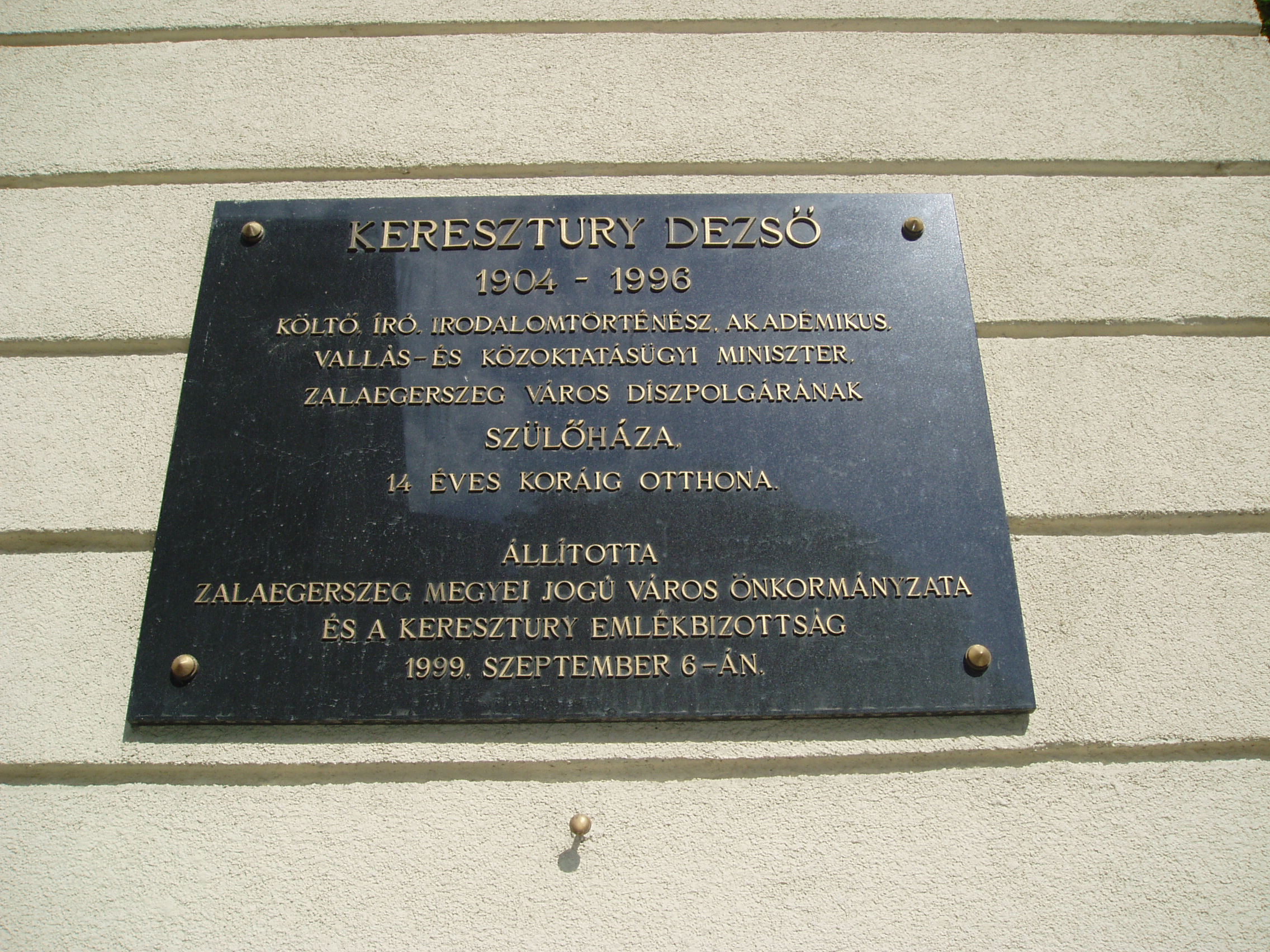 Nyilvános 1313 | 2817 | Zalaegerszeg, Mártírok útja 2. | Ebben a városközponti épületben született 1904. szeptember 6-án Keresztury Dezső (1904-1996) író, irodalomtörténész, kritikus, műfordító, miniszter, akadémikus. Édesapja ügyvéd volt, 1915-18 között a város polgármestere. Elemi iskolai tanulmányait és a gimnázium első négy osztályát szülővárosában végezte. Berlini évek után 1936-43-ban az Eötvös Kollégium tanára, közben 1937-43-ban a Pester Lloyd rovatvezetője volt. 1945-47-ben vallás- és közoktatásügyi miniszter, 1945-48-ban az Eötvös Kollégium igazgatója, 1948 után az MTA főkönyvtárnoka, 1950-71 között az Országos Széchenyi Könyvtár főosztályvezetője, 1985-től a Magyar Irodalomtörténeti Társaság elnöke, majd tiszteletbeli elnöke. 1973-tól az MTA levelező, 1982-től rendes tagja. A kortárs magyar irodalom sokoldalú művelője, a magyar irodalom- és művelődéstörténet elismert kutatójaként számos magyar és nemzetközi társaság tagja, kitüntetettje volt. 1968 után került újra szoros kapcsolatba szülővárosával, amelynek 1975-ben díszpolgára lett. 1993-ban megjelent "Emlékezéseim. Szülőföldjeim" című önéletrajzi kötete itt töltött gyermekkorának emlékeit is felidézi. Egykori iskoláját több alapítvánnyal is támogatta; édesapja szőlőhegyi hajlékát a városnak adományozta, ahol fokozatosan könyvtára is helyet kap, s alkotóházként működik. Szülőházán 1999-ben helyeztek el emléktáblát. A felvétel 2006 júniusában készült. Felh. irod.: Zalai életrajzi lexikon. = http://zalai.dfmk.hu/zalaiak |