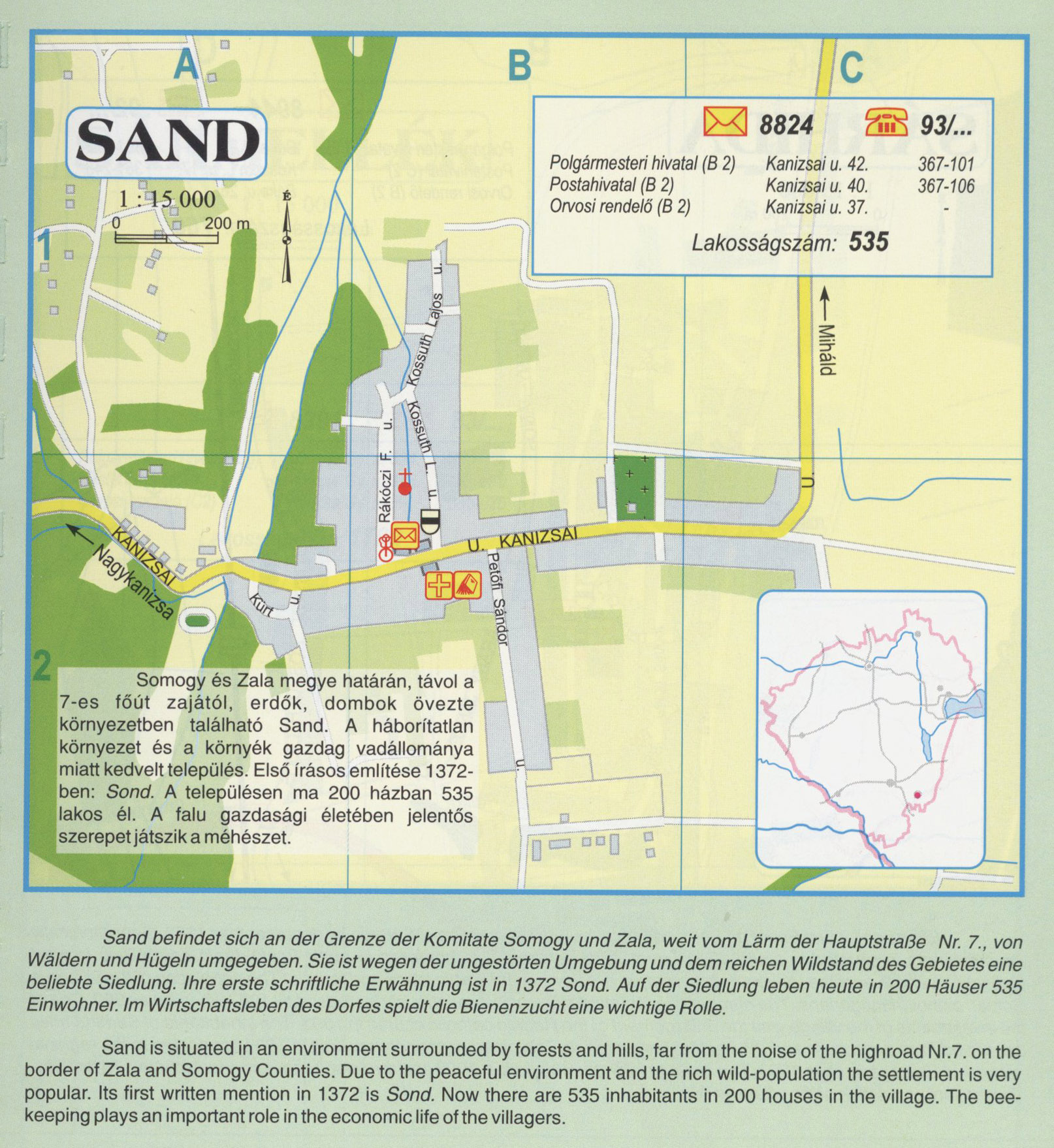 Nyilvános 2613 | 9624 | Sand | Somogy és Zala megye határán, távol a 7-es főút zajától, erdők, dombok övezte környezetben található Sand. A háborítatlan környezet és a környék gazdag vadállománya miatt kedvelt település. Első írásos említése 1372-ben: Sond. A településen ma 200 házban 535 lakos él. A falu gazdasági életében jelentős szerepet játszik a méhészet. Sand befindet sich an der Grenze der Komitate Somogy und Zala, weit vom Lärm der Hauptstraße Nr. 7., von Wäldern und Hügeln umgegeben. Sie ist wegen der ungestörten Umgebung und dem reichen Wildstand des Gebietes eine beliebte Siedlung. Ihre erste schriftliche Erwähnung ist in 1372 Sond. Auf der Siedlung leben heute in 200 Häuser 535 Einwohner. Im Wirtschaftsleben des Dorfes spielt die Bienenzucht eine wichtige Rolle. Sand is situated in an environment surrounded by forests and hills, far from the noise of the highroad Nr.7. on the border of Zala and Somogy Counties. Due to the peaceful environment and the rich wild-population the settlement is very popular. Its first written mention in 1372 is Sond. Now there are 535 inhabitants in 200 houses in the village. The bee-keeping plays an important role in the economic life of the villagers. A részlet a következő kiadványból származik/Die Teile stammen vom volgenden Buch/This text came from the following book: Cím/Titel/Title: Zala megye településeinek atlasza - 257 település részletes térképe/Atlas der Komitat Zala - 257 Detailte Siedlungskarten/Zala county\'s Atlas - 257 settlement maps. Közreműködő/contributor: Lackner László (1943) (fotó) Kiadás/Ausgabe/Publisher: Gyula : HISZI-MAP, 1997 Sorozat/Serie/Series: Indulástól - megérkezésig... ETO: 912(439.121-2) ; 908.439.121 Cutter: Z 19 ISBN: 963-610-025-4 Oldalszám/Seiten/Pages: 323, 81 p. Megjegyzés/Note: Lezárva/Abgeschlossen am/Closed am: 1997. máj. 30. |