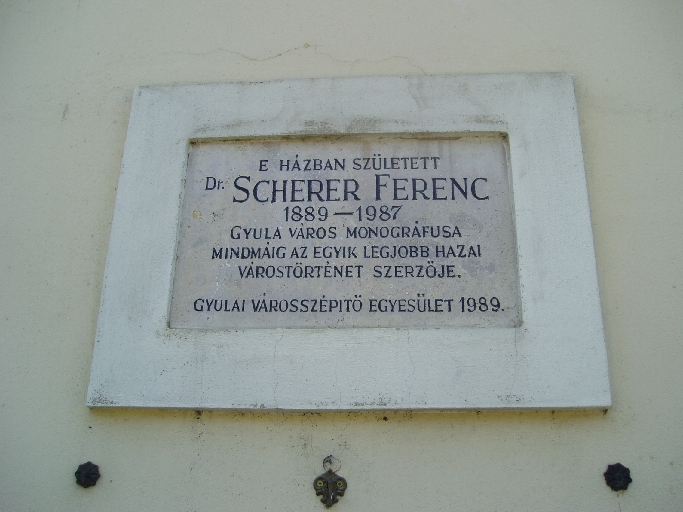 Nyilvános 1510 | 3189 | Rövid leírás | Teljes leírás (1.09 KB) | Gyula, Apor Vilmos tér 1. Az egykori Németgyula központja az Apor Vilmos mártír püspökről, az egykori gyulai plébánosról elnevezett tér. Meghatározó eleme a közepén álló Szent József-templom, illetve néhány körülötte álló XVIII-XIX. századi épület. Ezek egyike, az egykori németgyulai városháza látható a képen. Régebbi szárnya 1820 körül épült klasszicista stílusban, s 1857-ig ebben működött a városháza. A bal oldali klasszicizáló szárnyat 1874-ben toldották hozzá. Gyula és Németgyula egyesítése óta iskola működik benne. A bejárat mellett emléktábla jelzi, hogy itt, a tanítói lakban született dr. Scherer Ferenc (1889-1987), Gyula városának monográfusa, mely mindmáig az egyik legjobb magyarországi városmonográfia. A másik, kétnyelvű emléktáblát a gyulai németek betelepítésének 270. évfordulója alkalmából helyezték el 1994-ben. A fénykép 2007 júliusában készült. Felh. irod.: Czeglédi Imre: Gyula útikalauz. 2. bőv. kiad. Gyula, 1995 |