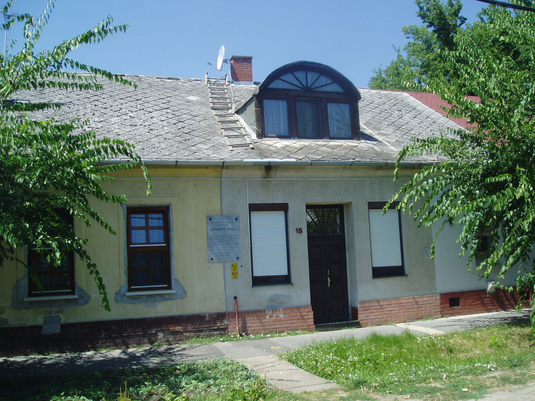Nyilvános 1134 | 1767 | Gyula, Munkácsy utca 15. | Ebben a földszintes házban - Oláh György asztalosmester egykori házában - lakott 1860-61-ben Reök István, Munkácsy Mihály nagybátyja és gyámja. A Bach-rendszer bukása után ugyanis mint régi negyvennyolcas a megyénél kapott állást, s Gyulára költözött (korábban Békéscsabán élt). Az Aradon asztaloslegényként dolgozó gyámfia, akkor még Lieb Mihály 1860 őszén őhozzá jött haza Gyulára. A sokáig váltólázban szenvedő fiút nagybátyja Karl Fischer helybeli rajztanár műtermében taníttatta, hogy az asztalosmesterséghez szükséges rajztudást elsajátítsa. S itt, Fischer mesternél látta meg őt a Wenckheim kastélyban (lásd: Gyula, Kossuth u. 15.) tartózkodó Szamossy Elek festőművész, aki felismerte Munkácsy tehetségét, magához vette, s Gyuláról távozván, a nagybácsi engedélyével magával is vitte. Így mentette meg a tehetséges fiút a magyar művészet számára. Munkácsy maga is azt vallja önéletírásában, hogy élete sorsa Gyulán dőlt el. A ház falán márványtábla őrzi Munkácsy emlékét, s ezen idézetet olvashatunk Munkácsy "Emlékeimből" című önéletrajzából. A fénykép 2007 júliusában készült. Felh. irod.: Czeglédi Imre: Gyula útikalauz. 2. jav., bőv. kiad. Gyula, 1995 |
