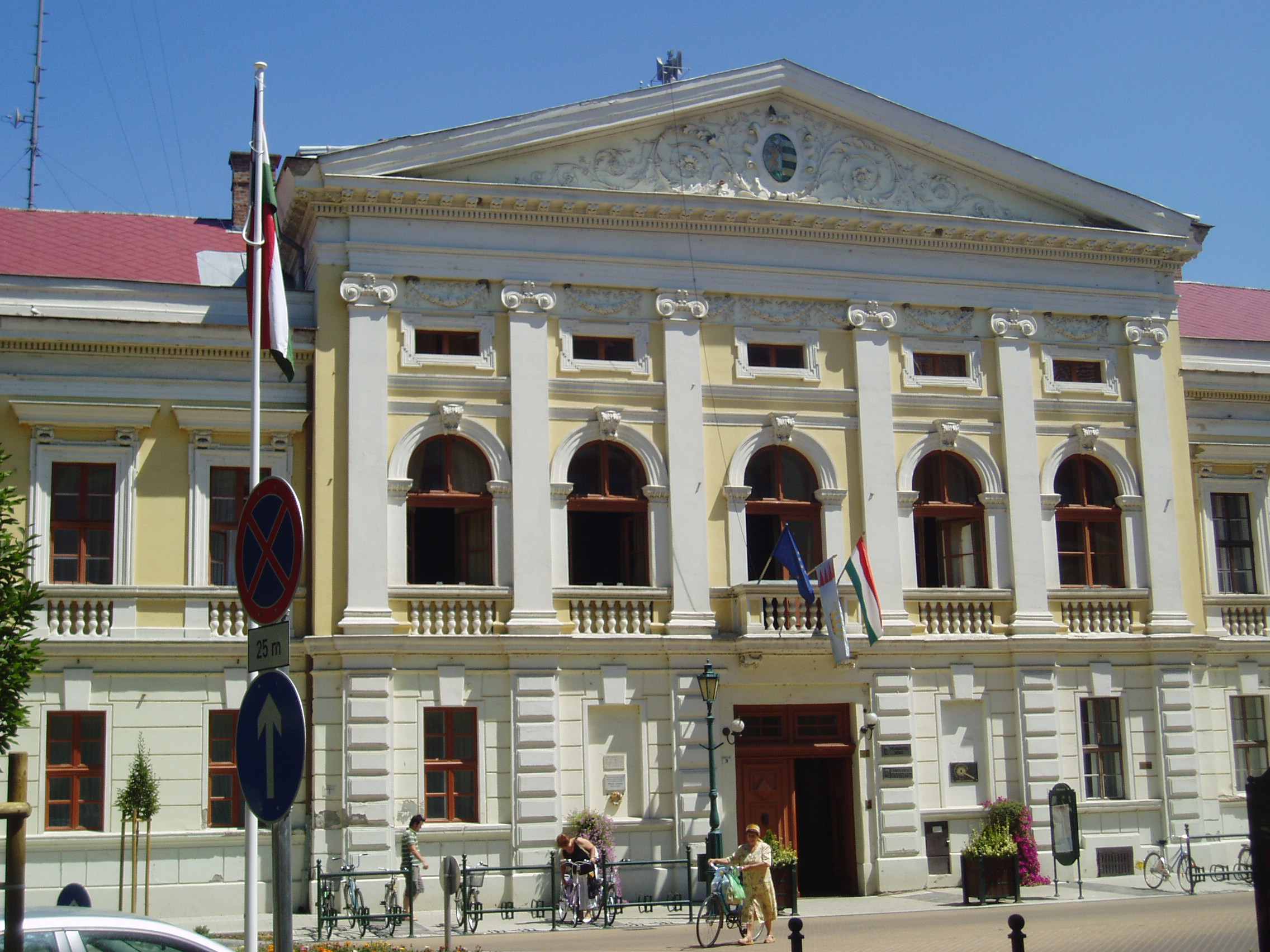 Nyilvános 1126 | 1627 | Gyula, Petőfi tér 3. Régi Vármegyeháza | A városközponti háromszög alakú hangulatos tér csaknem minden épülete történelmi vagy műemléki érték. Az egykori Vármegyeháza - a mai Városháza - a tér legszebb épülete. Eredeti formájában a XVIII. század utolsó harmadában épült az akkoriban újjátelepült Békés megye közigazgatási központjának. Azóta többszöri átépítéseket, alakításokat, bővítéseket hajtottak végre rajta. Ezek eredményeképpen ma barokk, klasszicista, romantikus és eklektikus részleteket egyaránt megfigyelhetünk az összességében eklektikus hatású épületen. A Vármegyeháza sok nevezetes eseménynek volt helyszíne. 1848. március 22-én az udvaron ismertették az egybegyűlt sokaság előtt a Pesten zajló eseményeket. A helyi hagyomány szerint 1849 júliusában a védbizottmány egyik ülésén mondta el utolsó politikai beszédét Petőfi Sándor. A költő akkoriban Mezőberényben tartózkodott, onnan rándult át a megyeszékhelyre. Az eseményt az épület homlokzatán emléktábla örökíti meg. A fénykép 2007 júliusában készült. Felh. irod.: Czeglédi Imre: Gyula útikalauz. 2. jav., bőv. kiad. Gyula, 1995 |